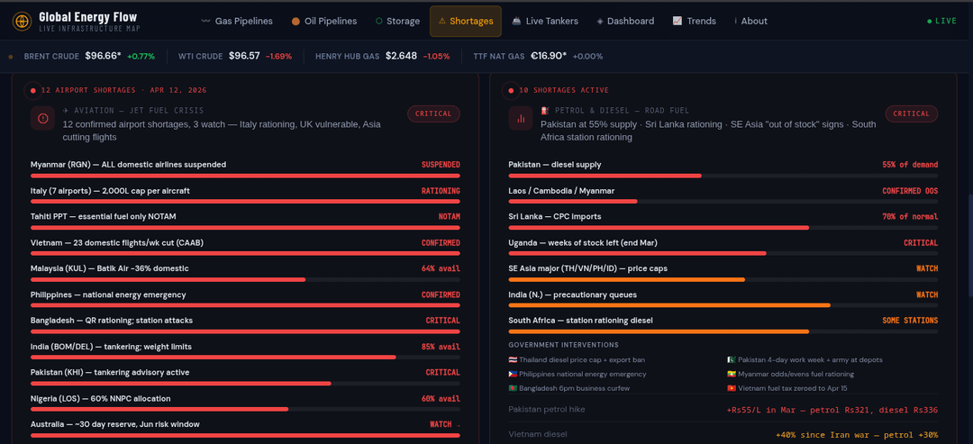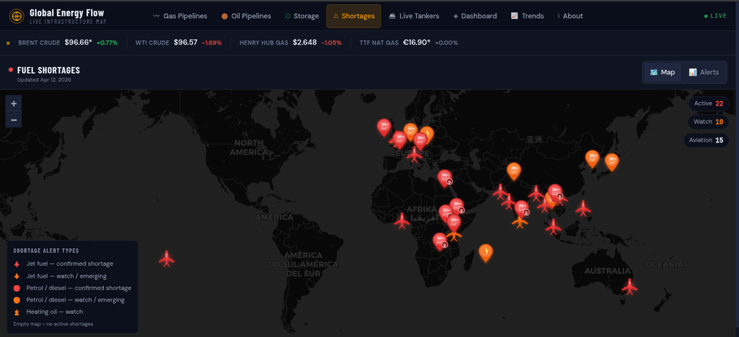 I built this interactive dashboard to track real-time shortages across key fuels: **jet fuel**, **petrol (gasoline)**, **diesel**, and **heating oil**. It combines live tanker tracking, pipeline flow maps, storage gauges, price charts, and shortage alerts for 18+ affected countries.