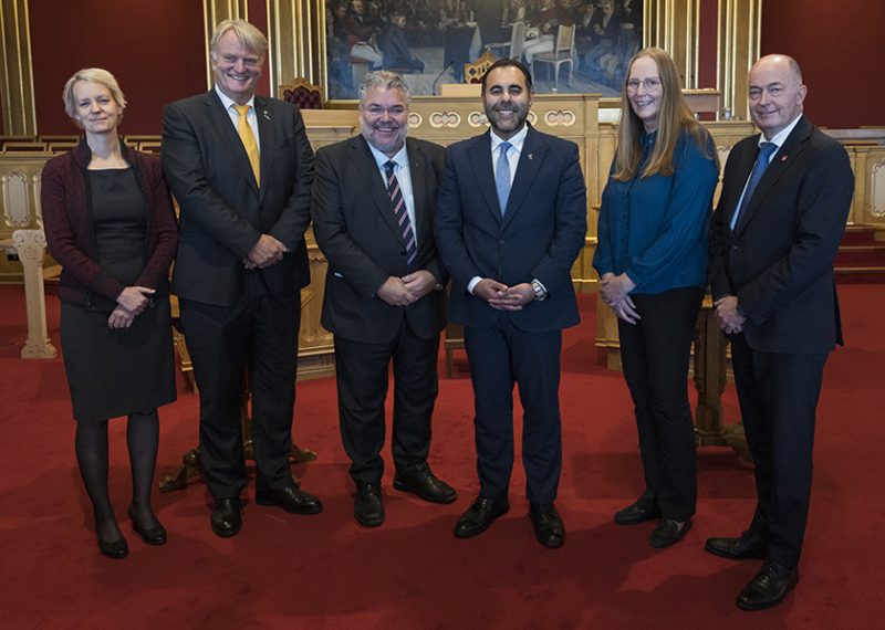 The president of the Norwegian Parliament (Masud Gharahkhani, third from right) ranks as the second most high-ranking official in Norway after the monarch. Morten Wold is standing next to him (third from left) in this photo of the parliamentary officers for session running from 2025 to 2029. Now Wold will be resigning his post. PHOTO: Stortinget