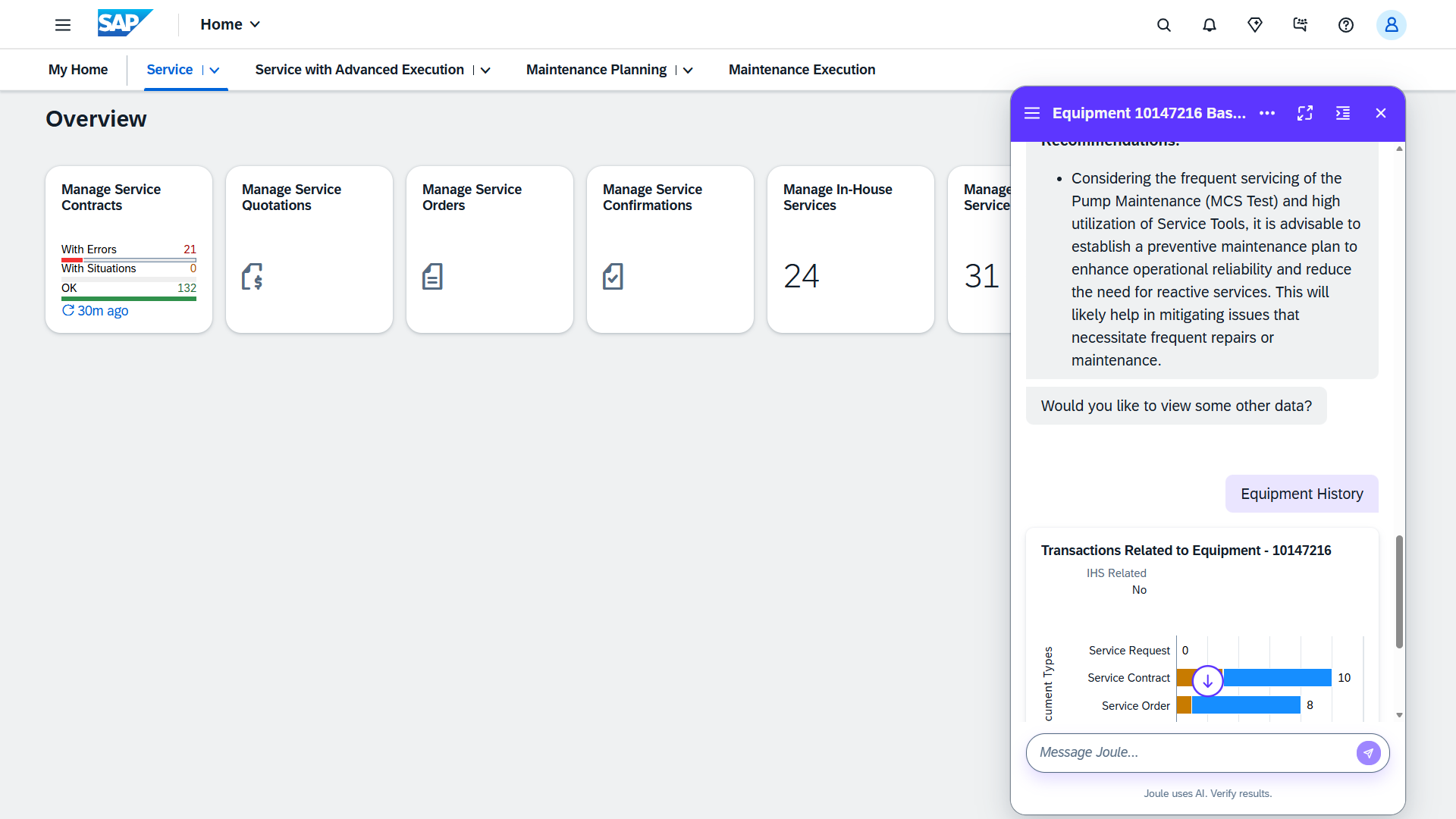 Service managers using the AI-assisted retrieval feature in SAP S/4HANA Cloud Private Edition gain a complete 360-degree view of customer equipment. The feature provides instant access to warranty information and a full history of service transactions, complemented by an AI summary and actionable recommendations. This allows service managers to more efficiently oversee service schedules, reduce potential downtime, and ensure customer equipment operates at peak performance.