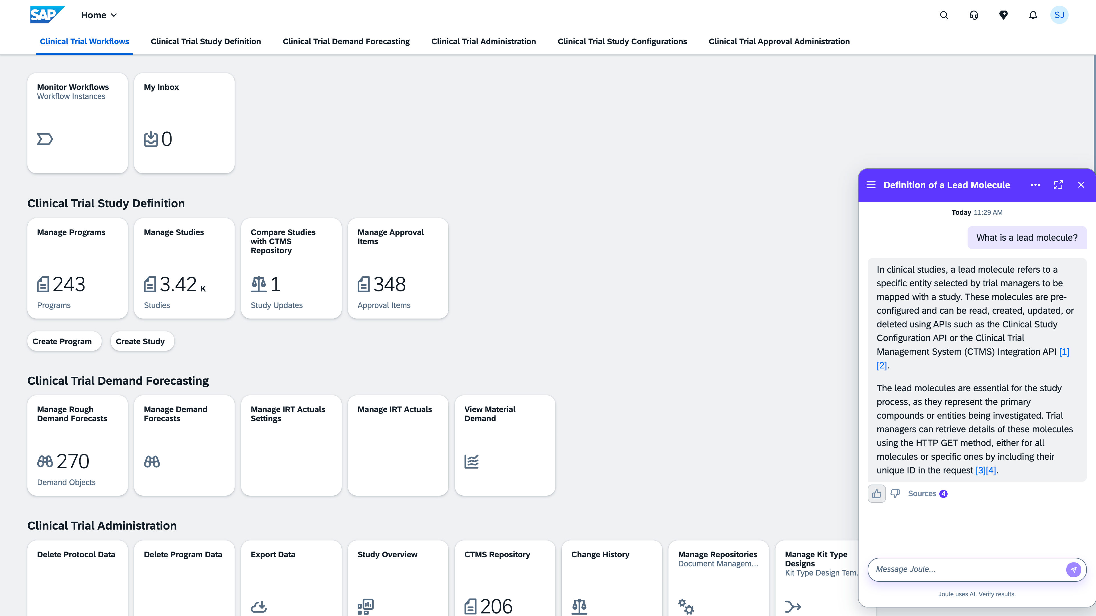 Clinical supply professionals juggling multiple tasks and complex systems need quick access to information without disrupting their workflow. Together with Joule, SAP Intelligent Clinical Supply Management delivers an intuitive, conversational interface that understands natural-language requests, enabling users to retrieve critical data and navigate to relevant applications effortlessly. This streamlined experience results in an 83% reduction in time spent on information searches, freeing teams to concentrate on higher-value activities and significantly boosting overall productivity.