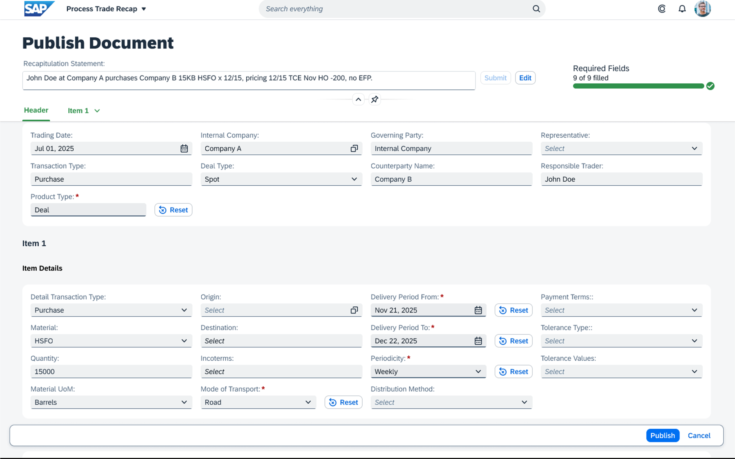 Commodity traders can transform how they capture and manage complex deals using the commodity work center in SAP Commodity Management. Working alongside Joule, the feature converts verbal or written negotiations into detailed draft deals, automatically populating the numerous fields that traditionally require extensive manual entry. This enables traders to redirect their focus toward negotiating better commercial outcomes, while improving data accuracy and driving greater operational efficiency across their trading activities.