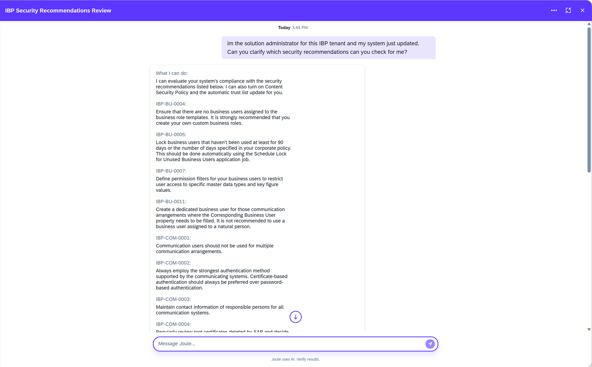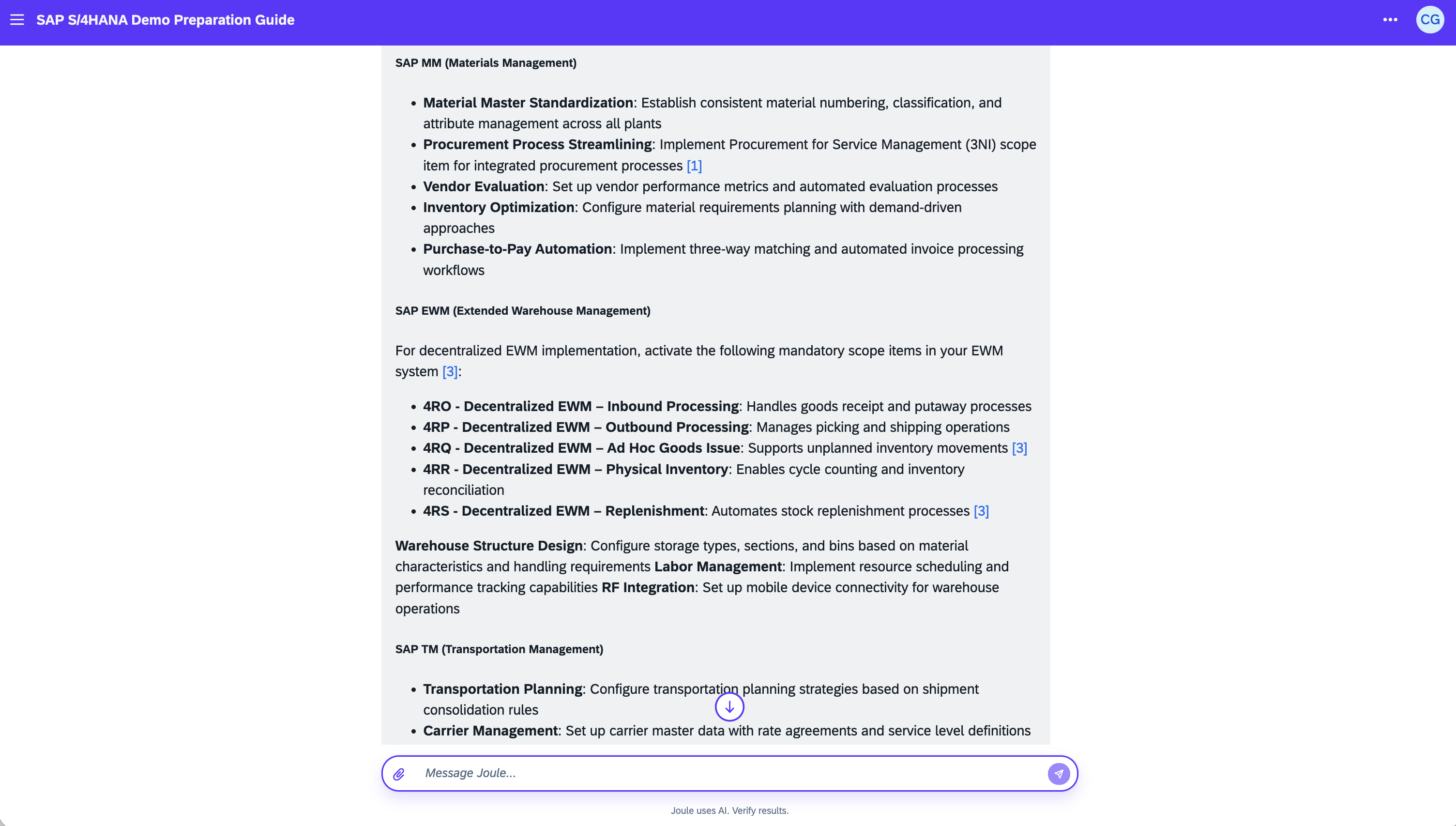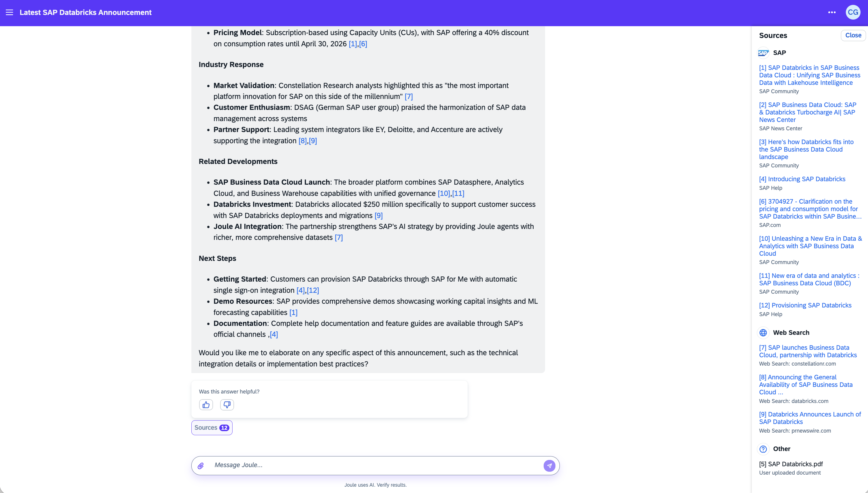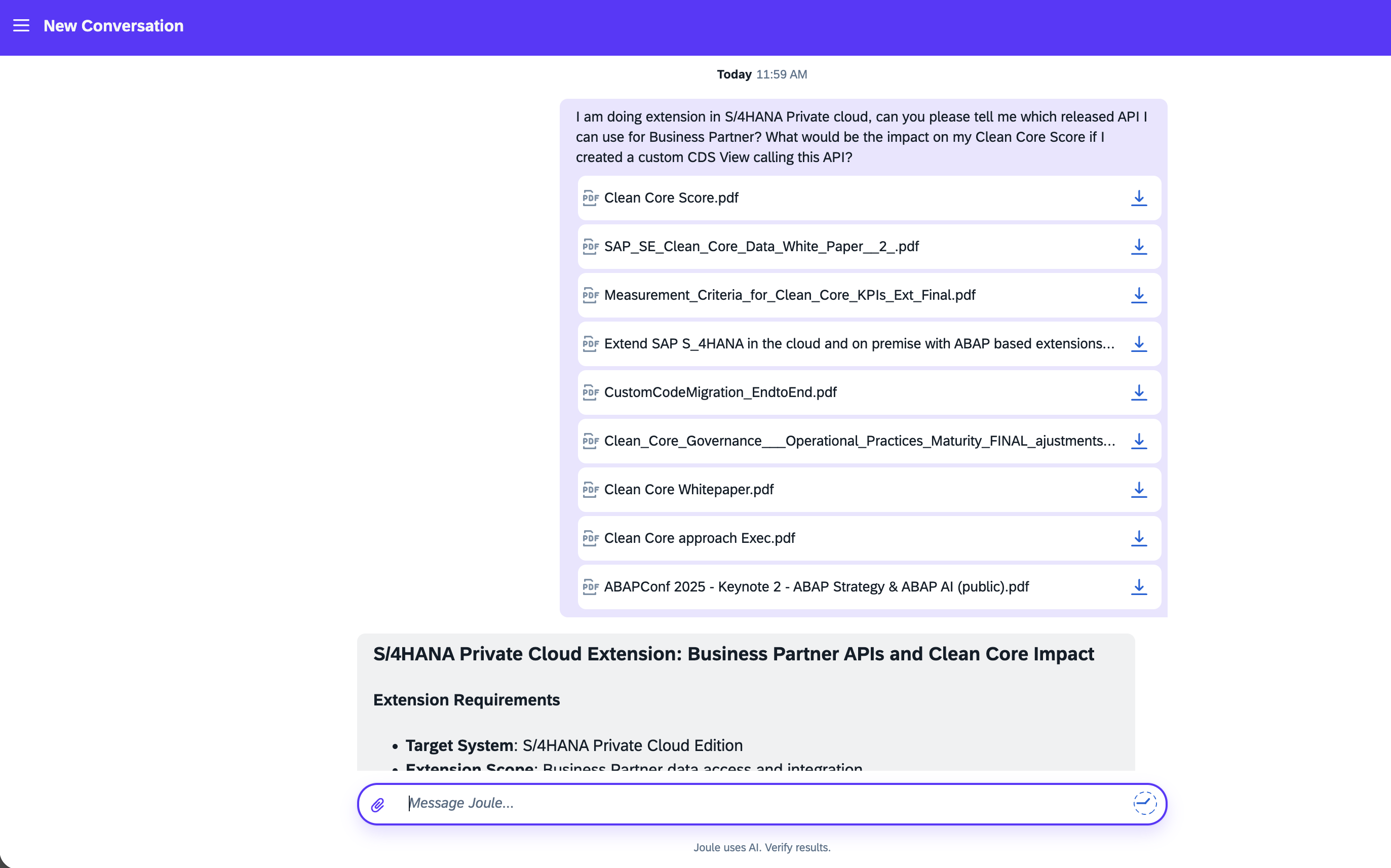 - SAP Joule for Consultants is a conversational AI solution that provides expert guidance on cloud transformations, drawing on SAP’s knowledge base. To improve trust and traceability, citations are now displayed in a dedicated side panel and can be grouped for clarity. Administrators can enable web search, allowing Joule to draw from public content while maintaining clear source attribution. For tailored answers to problems where the system may not have customer-specific documentation, consultants can now upload up to 10 PDF or text files directly into the chat. This is further enhanced by the inclusion of content from the SAP Enterprise Architecture Reference Library, which provides more complete and accurate answers to complex queries. Get started here.