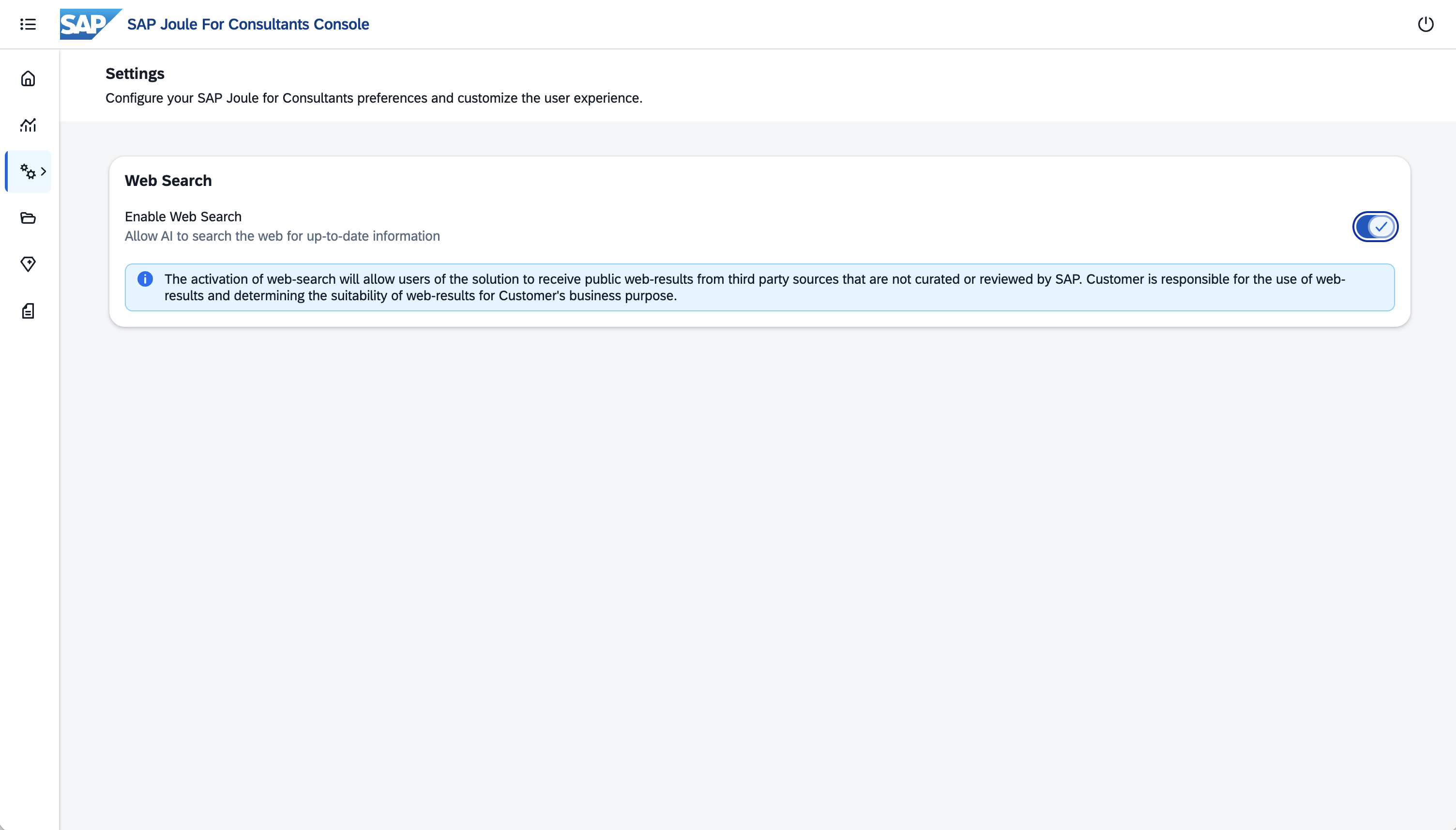 Administrators can now enable/disable web search via the control panel for all assigned end users in SAP Joule for Consultants.