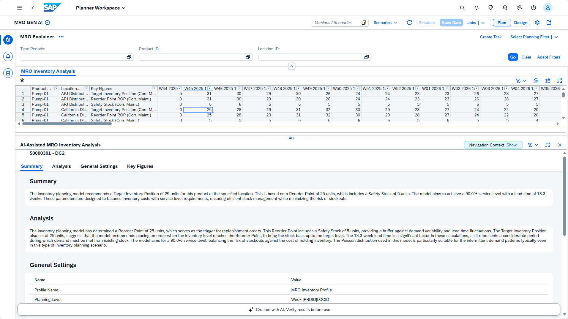 Inventory planners get a new analytical assistant in the MRO inventory analysis feature for SAP Integrated Business Planning. The feature accelerates root cause analysis by generating clear, natural-language summaries that explain the key drivers behind recommended safety stock and reorder points. By translating complex calculations into understandable insights, this capability enables planners to reduce time spent analyzing inventory runs by 30%, leading to faster adoption of outputs and ensuring that inventory parameters align with strategic business goals.