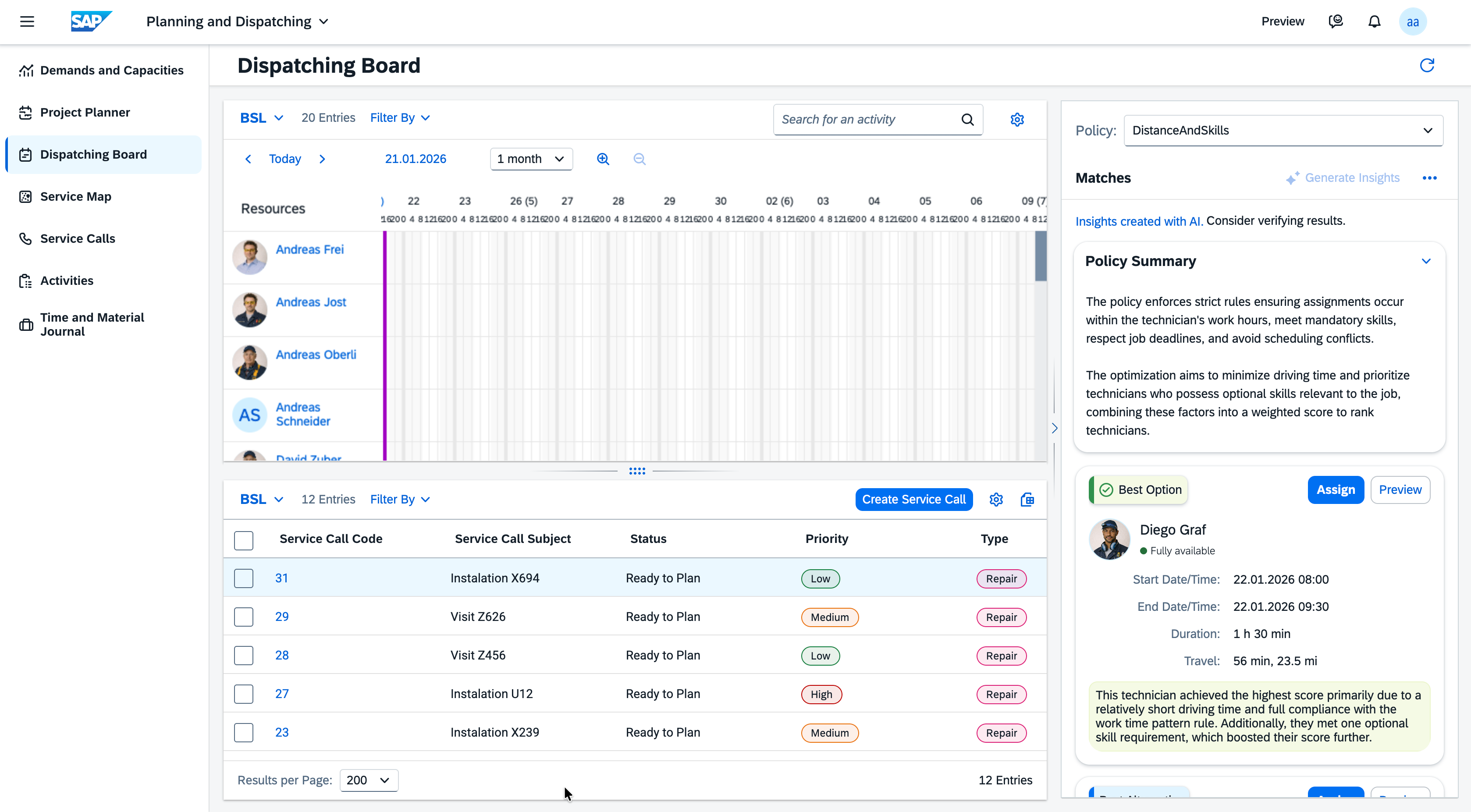 SAP Field Service Management, AI-assisted automated scheduling analytics