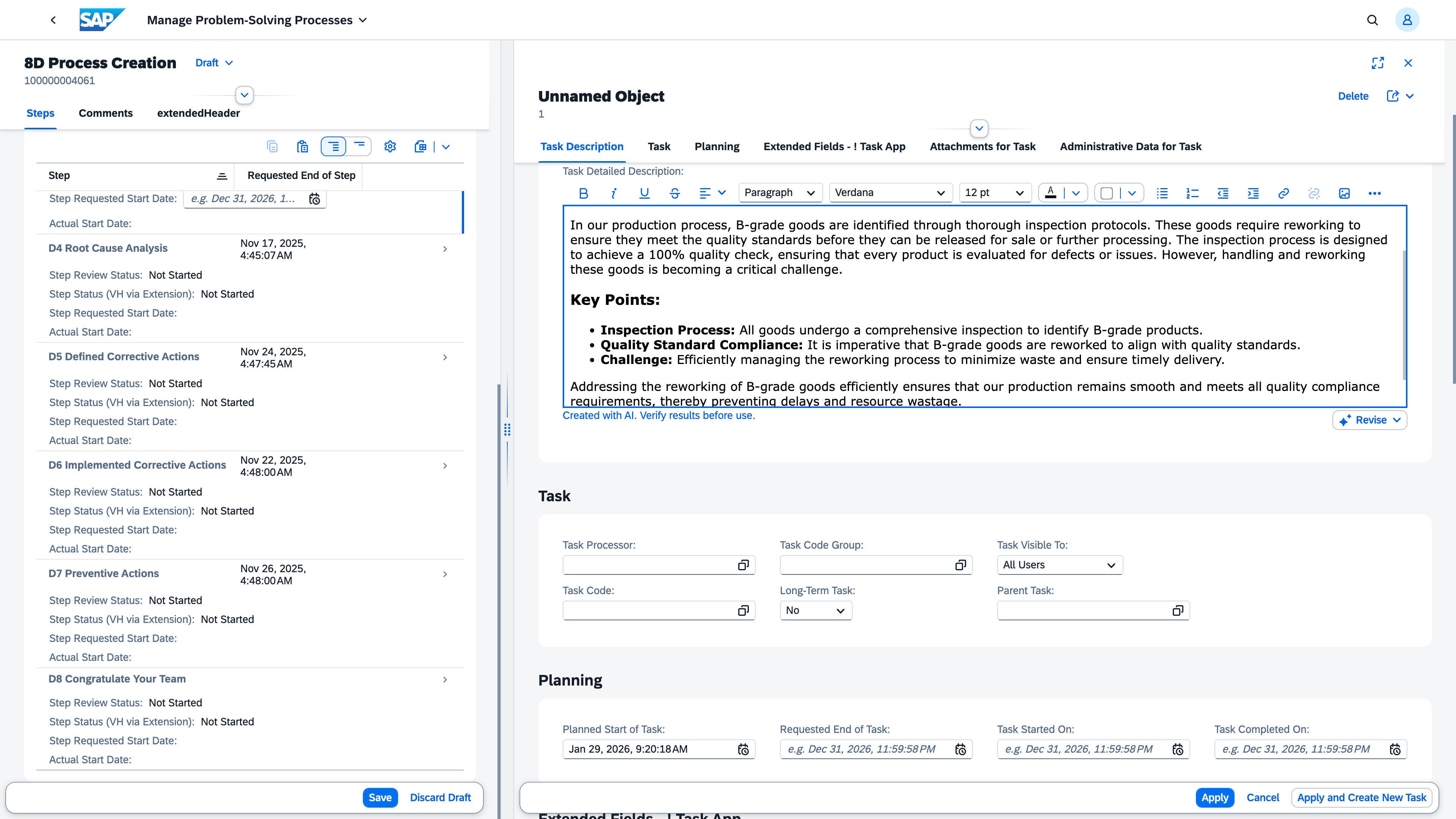 Quality managers documenting complex manufacturing issues can now generate clear, objective, and structured descriptions with minimal effort. SAP Digital Manufacturing for issue resolution offers description generation that refines rough initial inputs, removes bias and subjective language, and produces balanced, factual problem statements. With support for multilingual translation and enhanced clarity, organizations can achieve up to five percent improvement in quality engineer efficiency during issue handling and up to 10% reduction in errors throughout the problem resolution process.