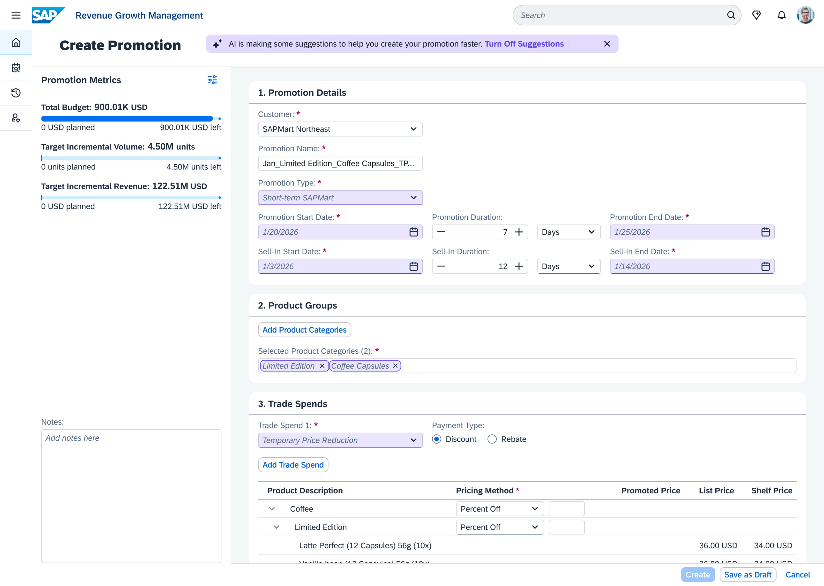 SAP Revenue Growth Management, AI-assisted trade promotion creation