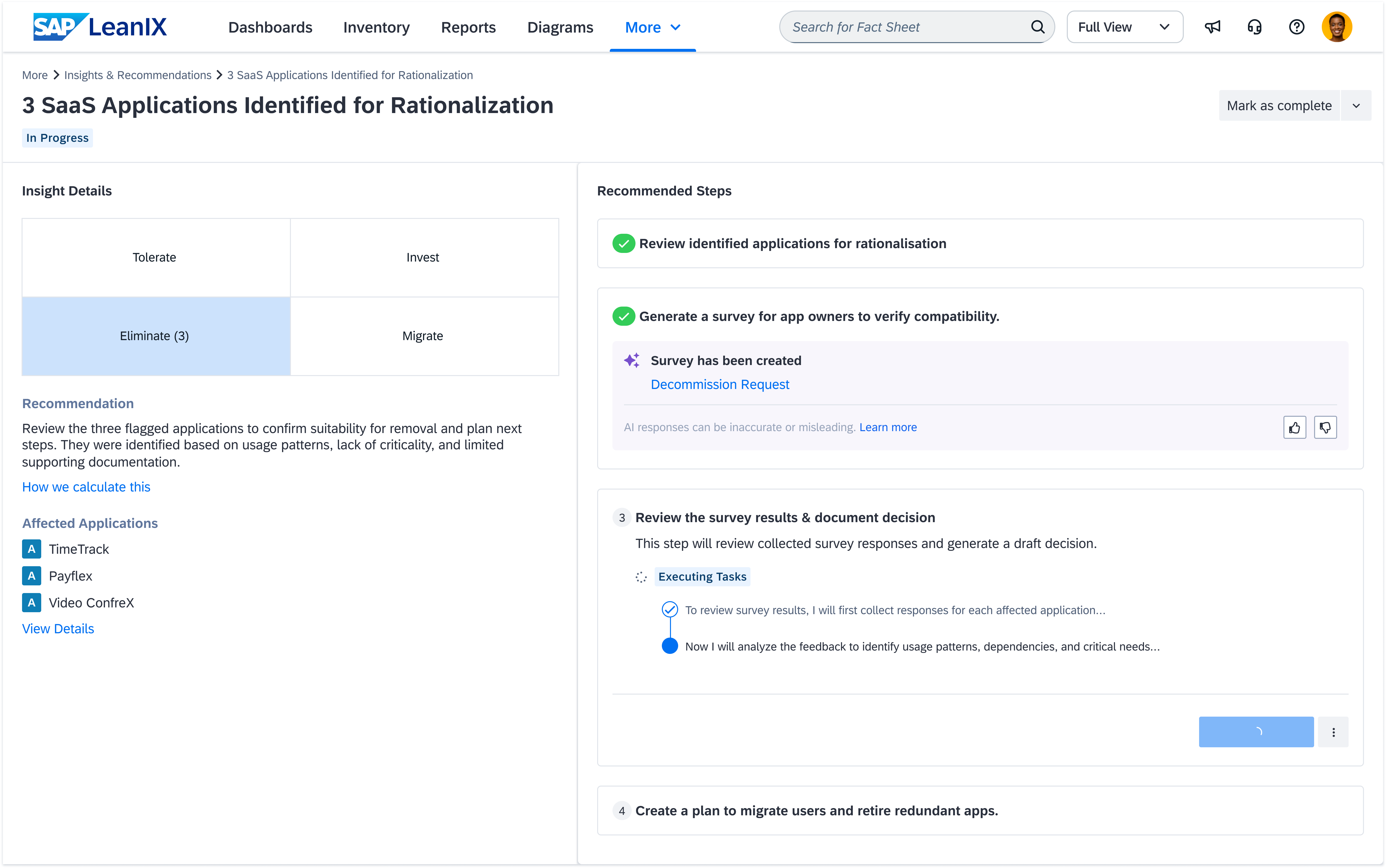 Enterprise architects seeking to accelerate transformation initiatives can leverage SAP LeanIX to surface actionable insights directly from their architecture inventory. The feature analyzes enterprise architecture data to identify opportunities and guides users through the workflows and tasks needed to efficiently act on recommendations. Organizations benefit from a 95% reduction in time to discover insights, 80% faster transformation execution, and a five percent reduction in value erosion from delayed action. Overall, this feature drives greater architectural productivity and more agile decision-making.
