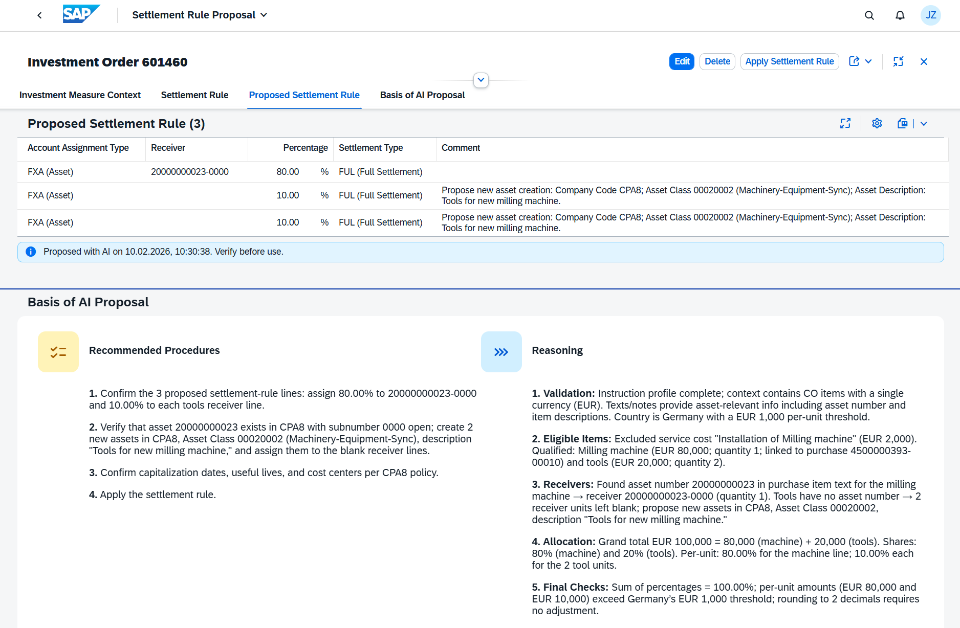 Overhead and asset accountants can now streamline the complex process of creating settlement rules for investment measures, eliminating the traditionally time-consuming, error-prone manual configuration. The solution automatically determines receivers, calculates percentages, and proposes feasible rules based on contextual data and user-defined instruction profiles. Organizations reduce the effort required to create full settlement rules by 50% while simultaneously improving accuracy in asset capitalization and enhancing overall operational efficiency across their financial processes.