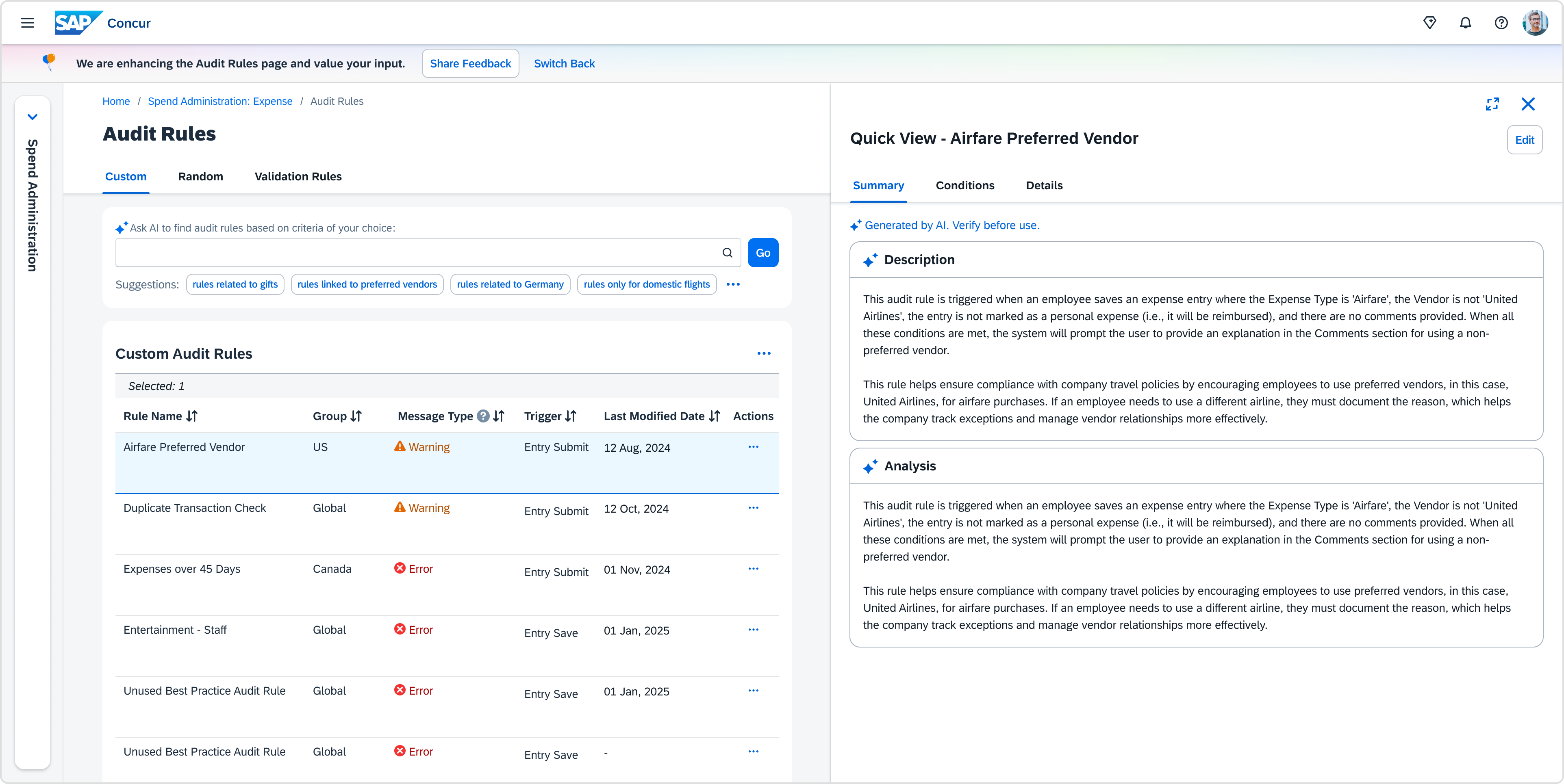 Expense administrators responsible for managing complex audit rule setups can now interact with their configuration environment in plain language, eliminating the need for deep technical expertise or tedious manual adjustments. This AI-assisted feature enables admins to search existing rules, create new ones, and receive real-time explanations simply by asking questions like “What rules apply to meals in France?”, delivering clear, actionable guidance instantly. The outcome is a 40% reduction in audit rule configuration effort, fewer support tickets, and empowered administrators who work with greater independence, accuracy, and confidence in maintaining compliance logic.