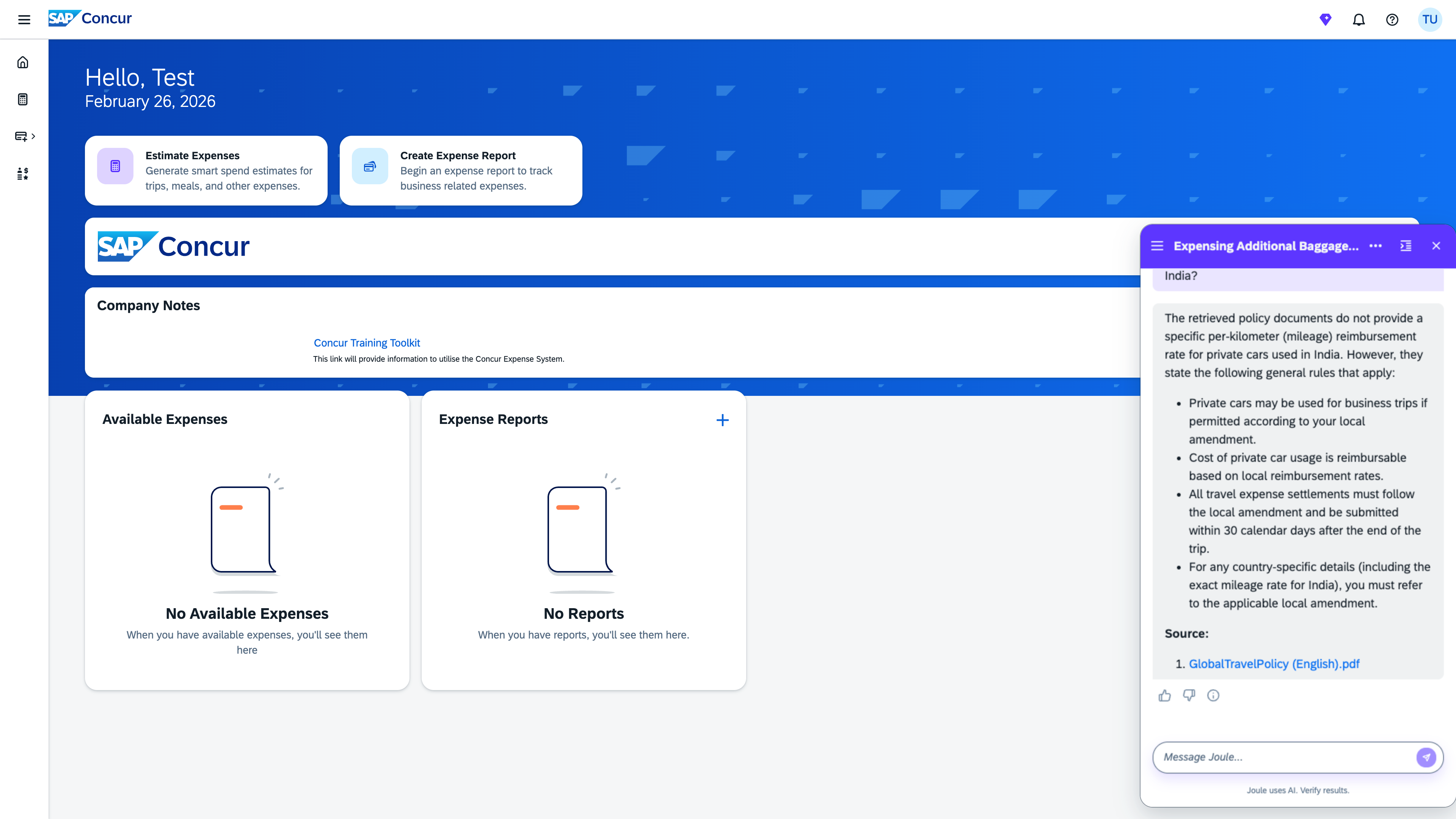 Business travelers seeking quick answers to company travel and expense policies no longer need to sift through lengthy documents or wait for admin responses. Policy navigator in Joule allows employees to ask questions in natural language and receive clear, contextual guidance grounded in approved policies, whether planning a trip, in the middle of a journey, or completing an expense report. The result is in-the-moment policy clarity that prevents non-compliant spend before it happens, reduces support tickets, and empowers travelers to make confident, compliant decisions without disrupting their workflow.