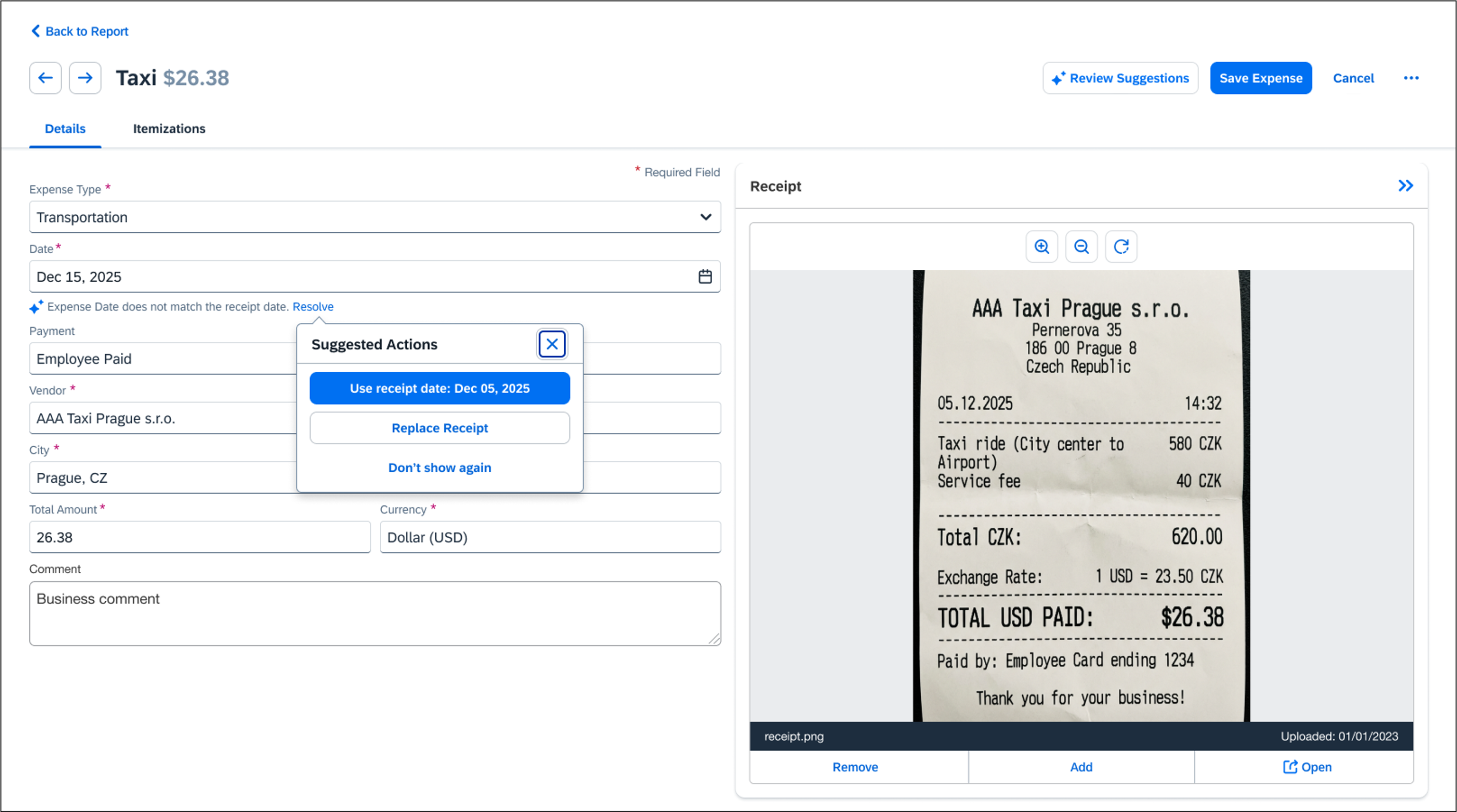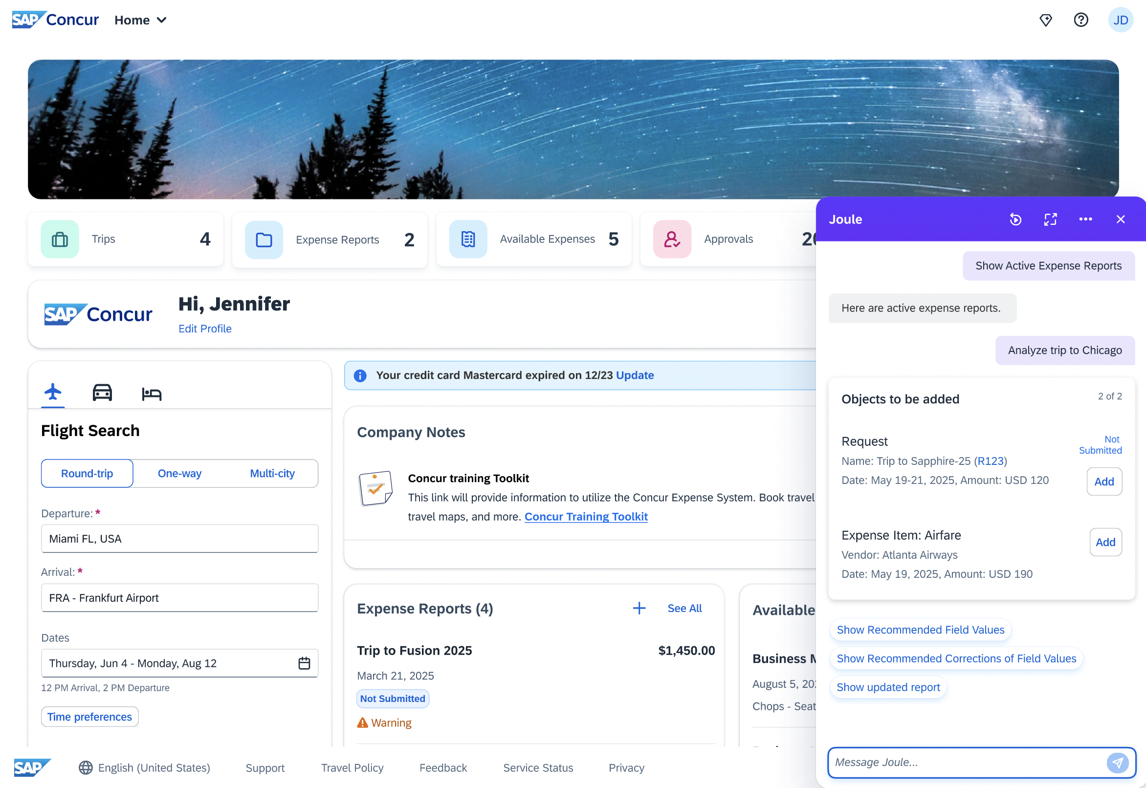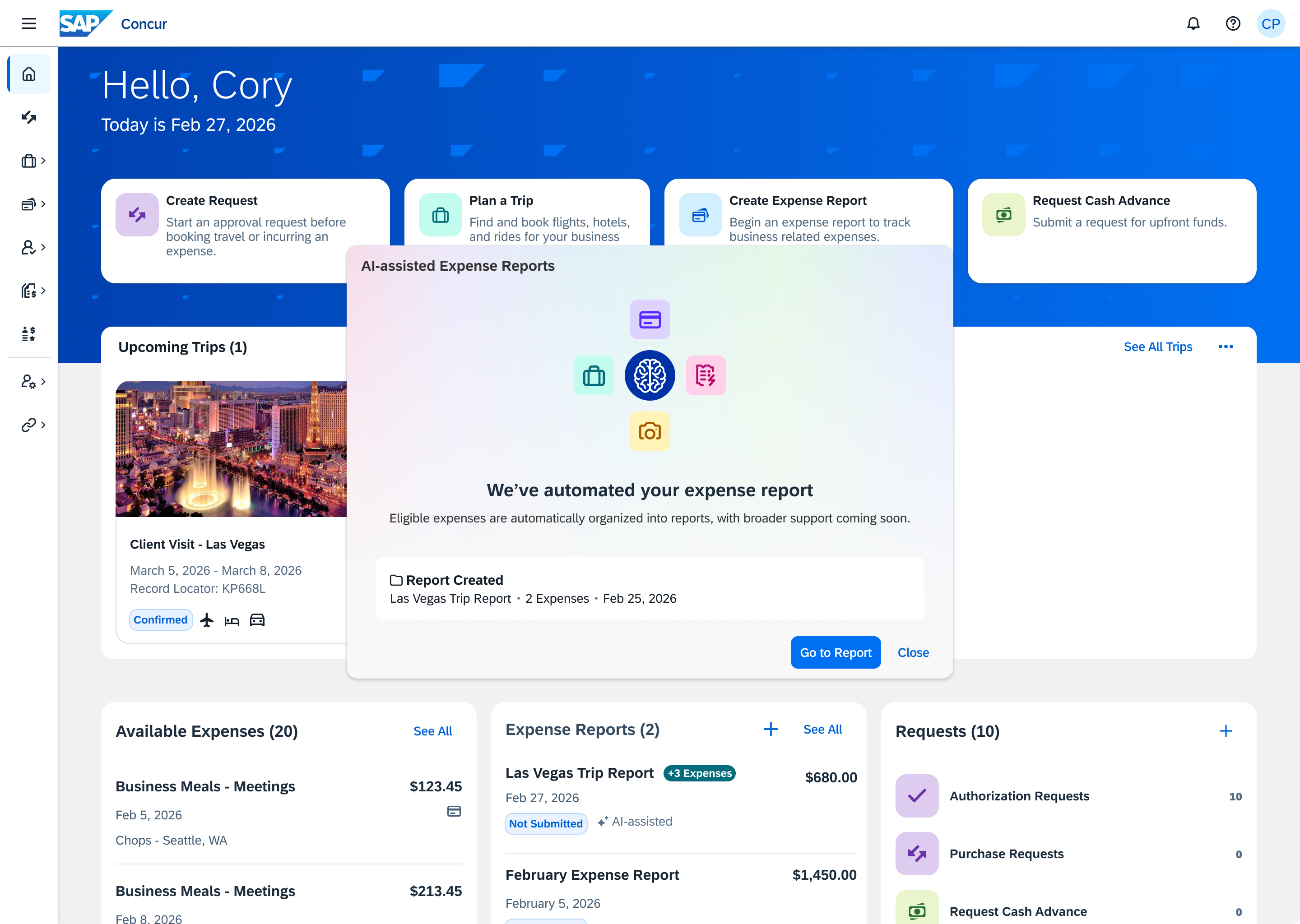 Employees burdened by the administrative chore of creating expense reports can now delegate the heavy lifting to a Joule Agent. This agent automatically builds expense reports by aggregating transactions, populating custom fields based on contextual details and user history, and preparing everything for a quick review before submission. The outcome is up to 30% reduction in time on task for auto-generated expense reports. This offers a modern expense management experience that slashes manual data entry, accelerates the submission process, and frees employees to focus on high-value work rather than paperwork.