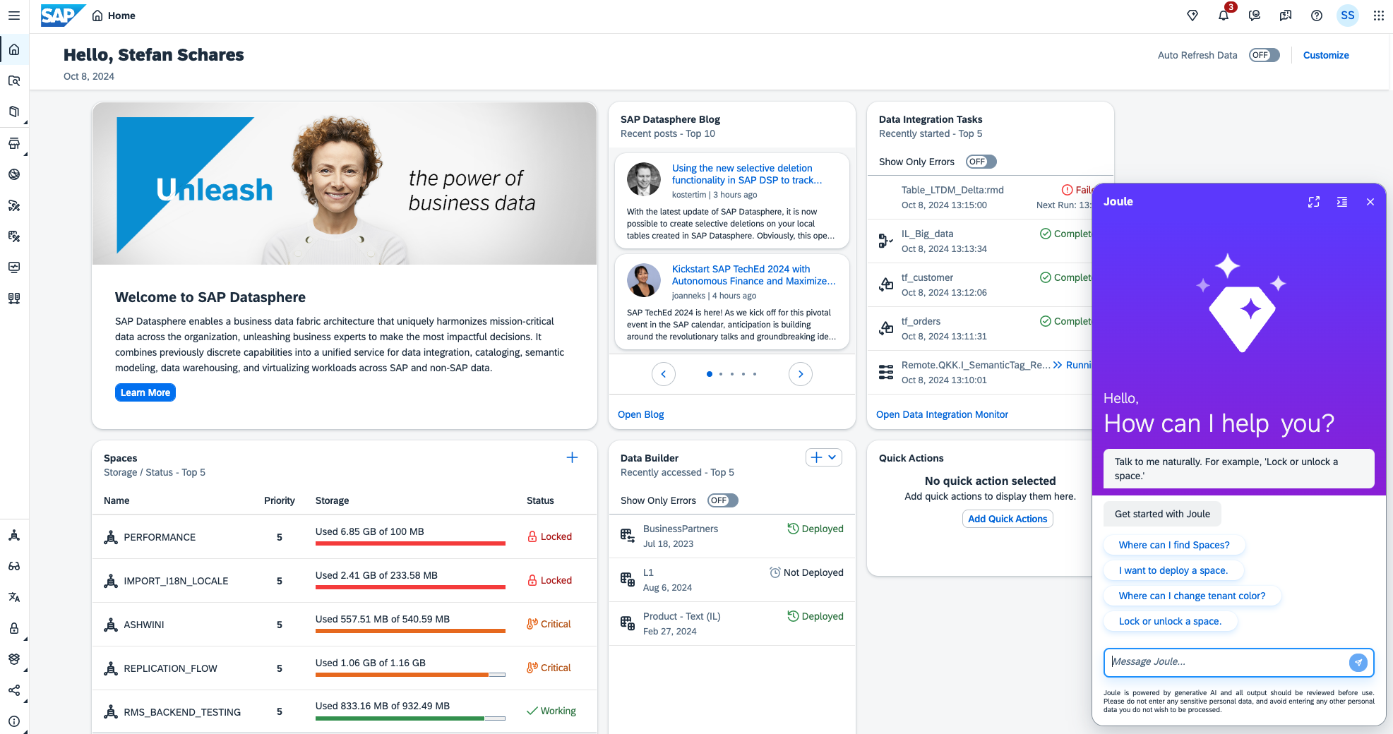 Data professionals working within SAP Datasphere can now accomplish informational, navigational, and transactional tasks through natural conversation with Joule. Whether asking how to use specific functionalities, retrieving details about a SAP Datasphere instance, or switching system settings like language preferences, users receive instant answers with direct references to product documentation. Joule can even execute tasks directly from the conversation without requiring interaction with the standard interface. This direct execution reduces reliance on internal IT support and enables faster, more intuitive navigation throughout the platform.