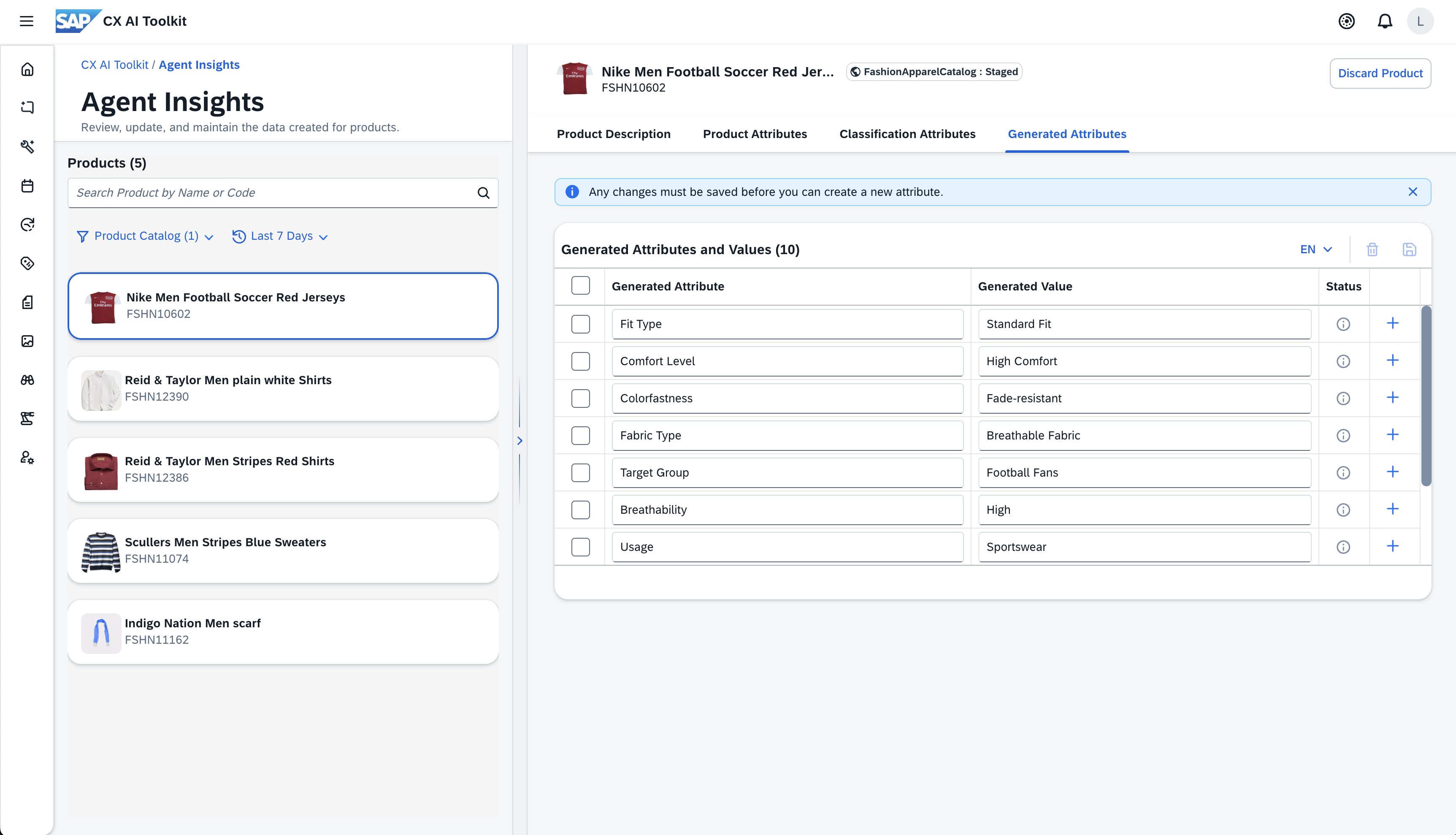 E-commerce product managers tasked with maintaining large SAP Commerce Cloud catalogs gain an always-on agent that continuously reviews product descriptions, attributes, and translations against company quality standards. This agent pinpoints merchandising gaps and delivers actionable recommendations to enhance catalog accuracy, ensure consistency across languages, and improve product discoverability. The business impact is a 70% reduction in time to translate catalog data, 65% less time spent adding descriptions per asset, and a five percent reduction in data quality costs, all of which contribute to higher conversion rates and a more agile merchandising operation.