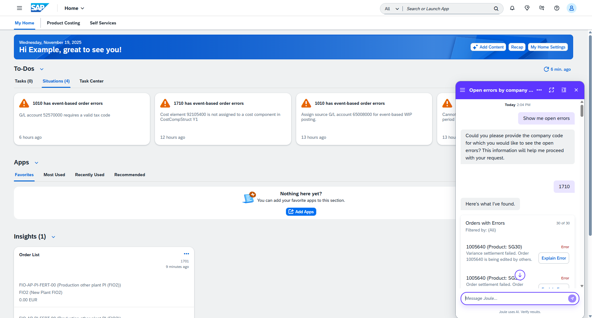 - SAP Business AI for finance offers greater efficiency and insight across critical processes. Joule now translates complex e-invoicing errors into plain language. The Dispute Resolution Agent automates root-cause analysis for invoice disputes, while payment advice processing significantly reduces document processing time. Unstructured data, such as PDFs, can now be automatically transformed into sales orders, and accountants can access natural language explanations for complex fixed asset calculations. Users can personalize their home page and easily understand system errors using natural language across SAP S/4HANA Cloud Public Edition. Learn more below.