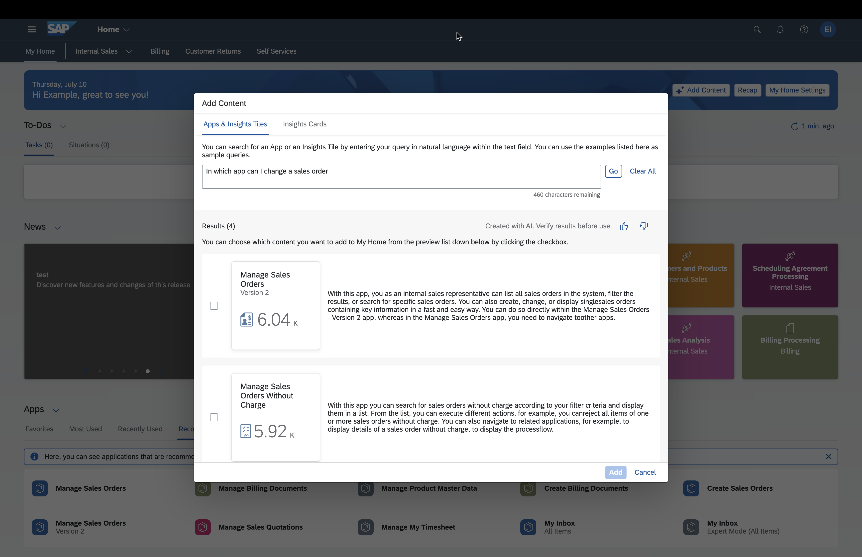 SAP S/4HANA Cloud Public Edition users can easily configure their home page with the most relevant applications through AI-assisted smart personalization. By describing their task in natural language, the system identifies the appropriate app, which can then be added to their home screen with a single click. This intuitive capability reduces the cost of personalizing the home page by 33%, shortens the learning curve for new users, and improves satisfaction by keeping frequently needed tools readily accessible.
