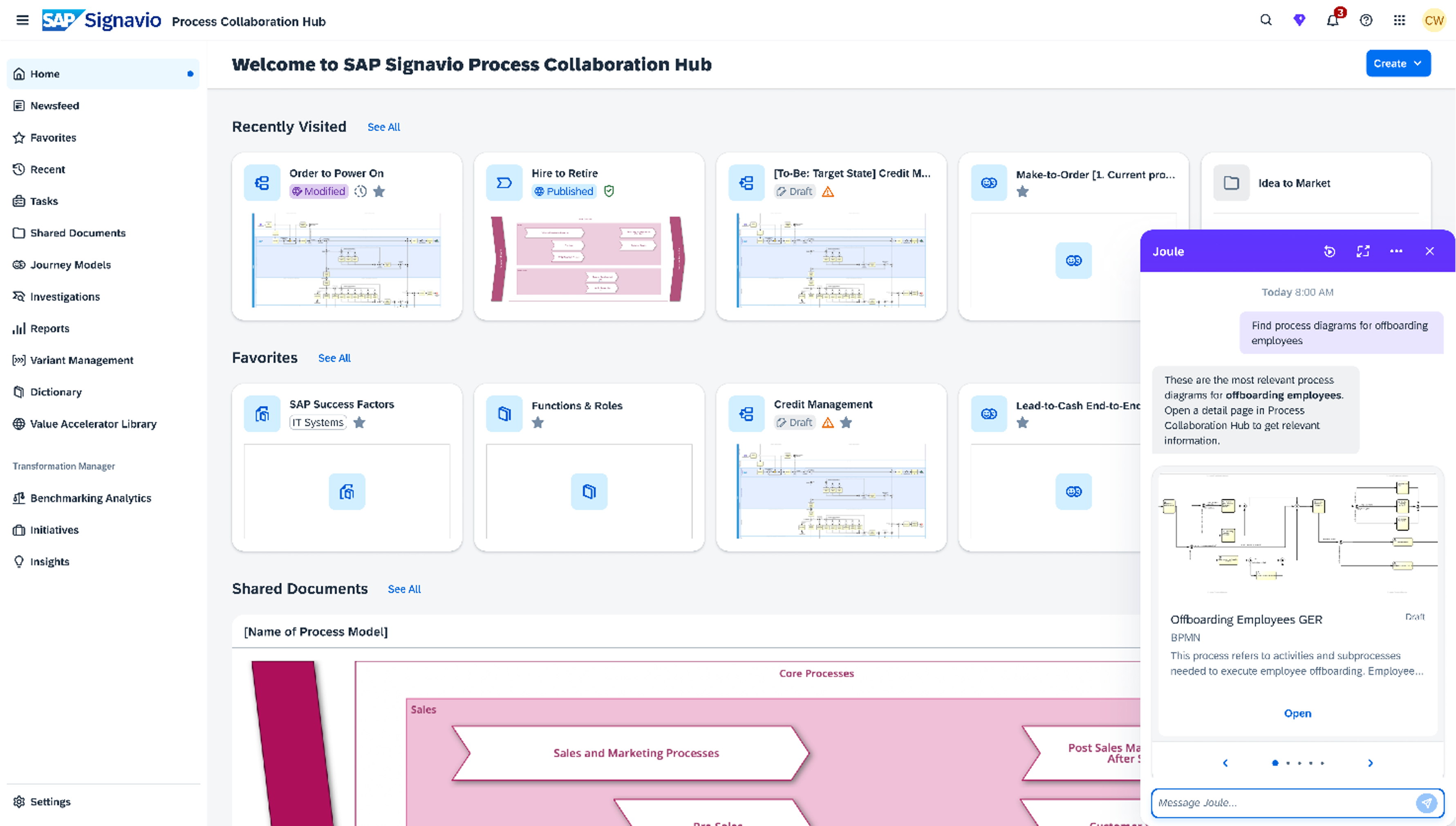 - SAP Business AI for business transformation management provides the critical insights needed to navigate and accelerate organizational change. Joule is now in SAP Signavio, enabling natural-language searches that cut information discovery time. Business process model and notation simulations in SAP Signavio provide clear, actionable summaries directly within process diagrams. Meanwhile, enterprise architects can leverage guidance in SAP LeanIX to surface actionable insights directly from their architecture inventory, accelerating transformation execution and reducing the time to uncover them. Read more about transformation management below.