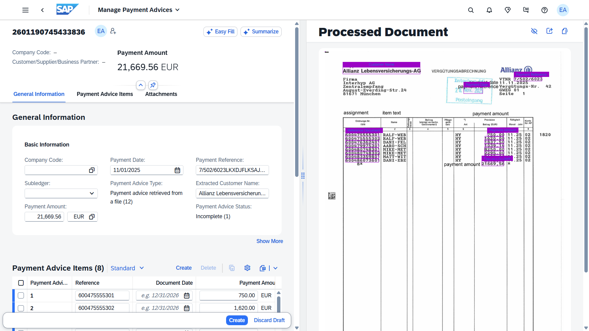 SAP Self-Billing Cockpit, AI-assisted document processing