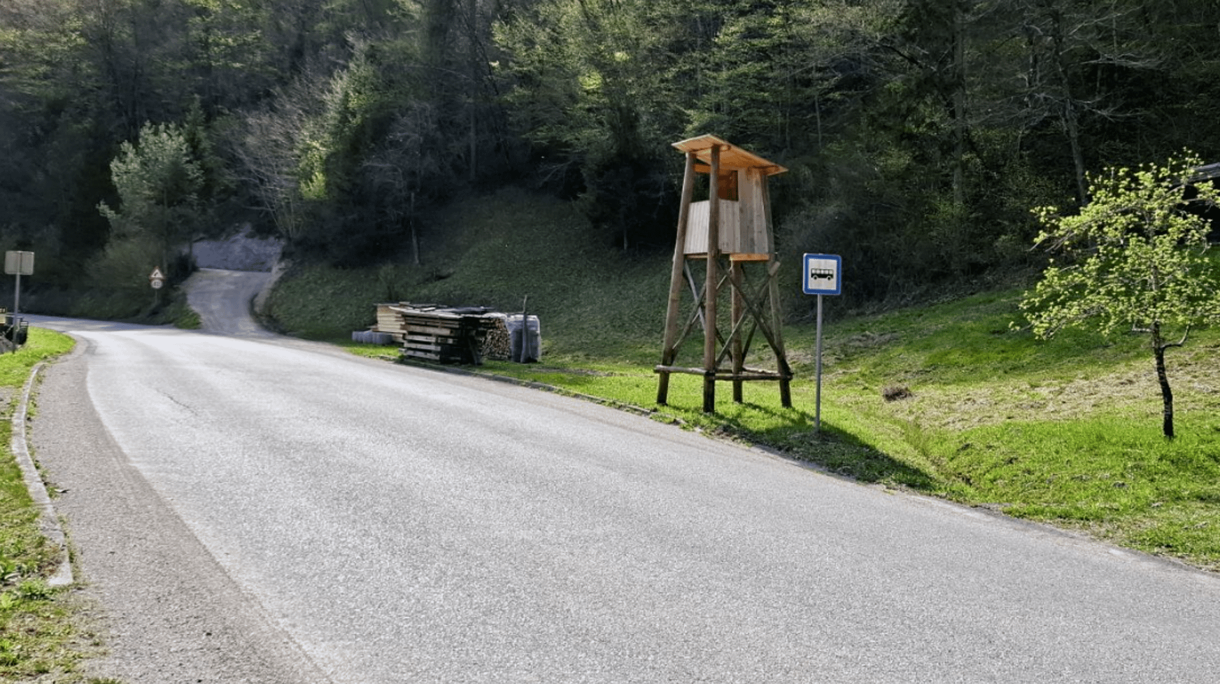 Lovska preža. Po vsej verjetnosti pripravljena, da jo odpeljejo nekam drugam. Dvomim, da bo kdo tukaj ob cesti uporabljal prežo.