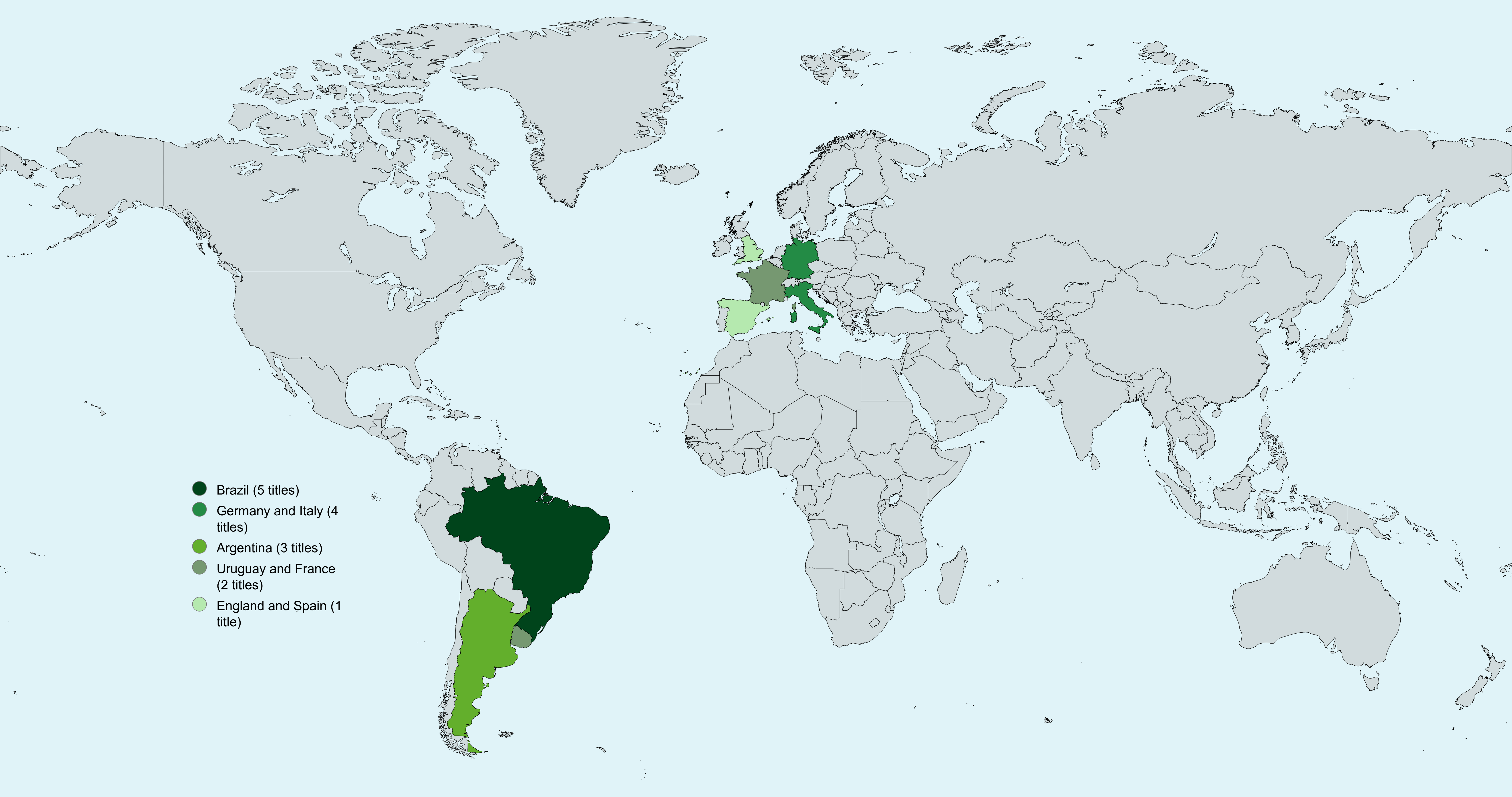Interesting map. Apart from Uruguay and Italy, these countries represent the powerhouses of modern football. It doesn’t look like anyone else can even come close to winning it any more