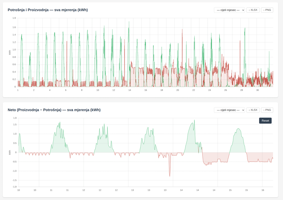 I have a solar power plant and it has always been a problem for me what https://mjerenje.hep.hr it only shows raw data tables – slow, no graphs, no analytics whatsoever. The application connects to your HEP user account, periodically pulls measurements and displays them in a more transparent way:
