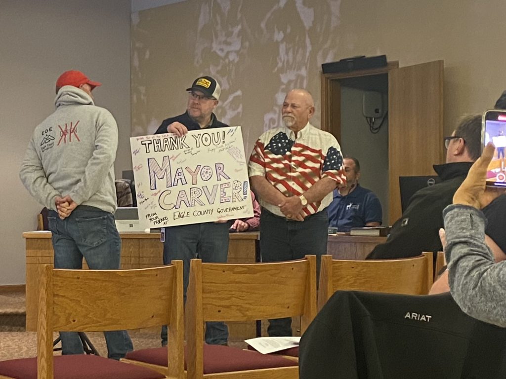 Eagle County Commissioner Tom Boyd and County Manager Jeff Shroll attended the meeting, presenting Carver with a posterboard from the Eagle County government which was signed by employees thanking him for his service.