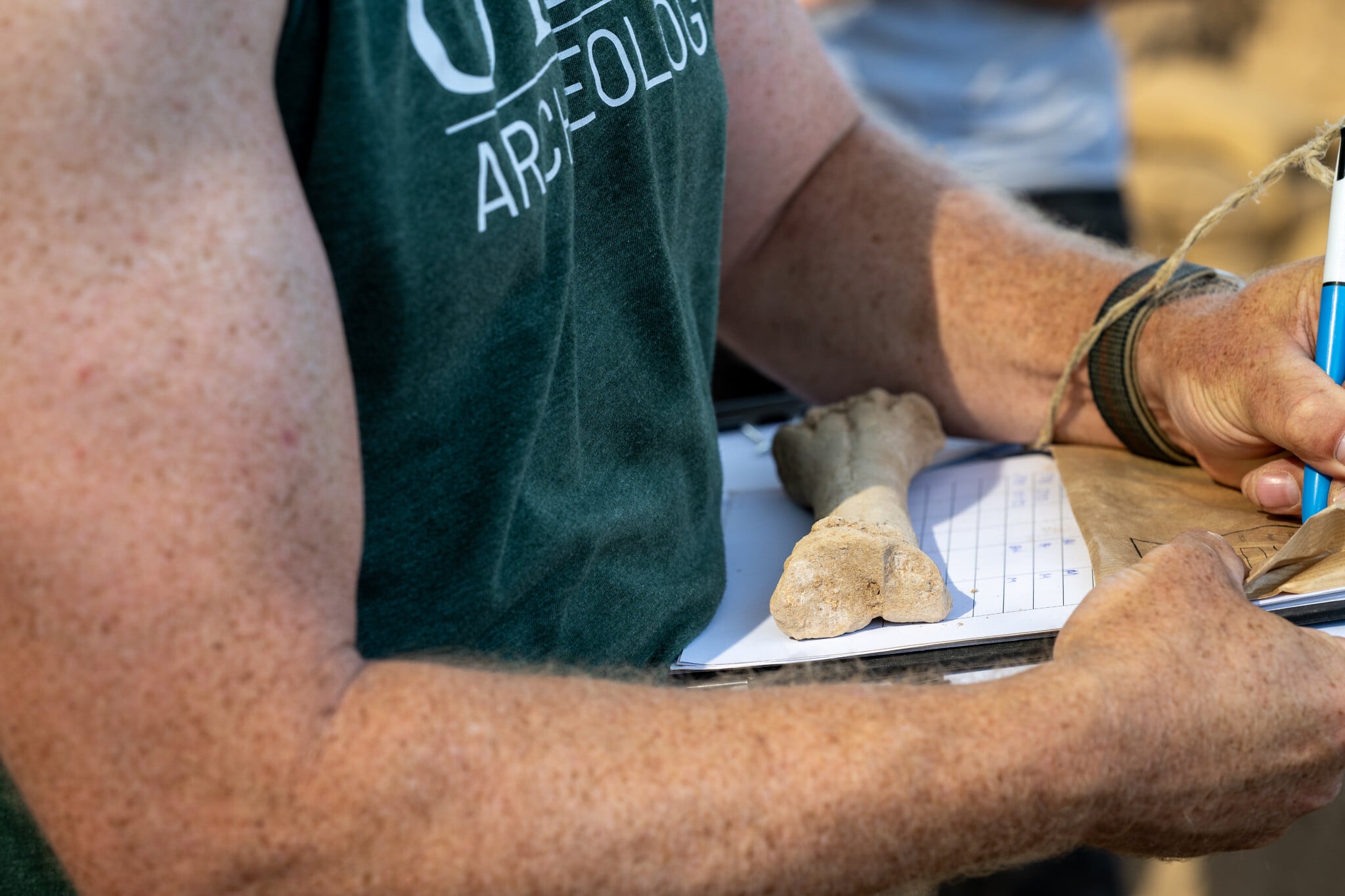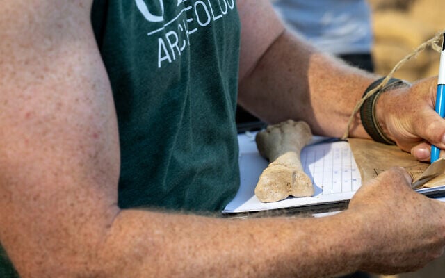 An animal bone found at Tel Hazor (Upper Galilee) in the area of the Lower City by the University of Haifa in July 2023. (Courtesy Ben Siegel/Ohio University and the Hazor Lower City Excavations)