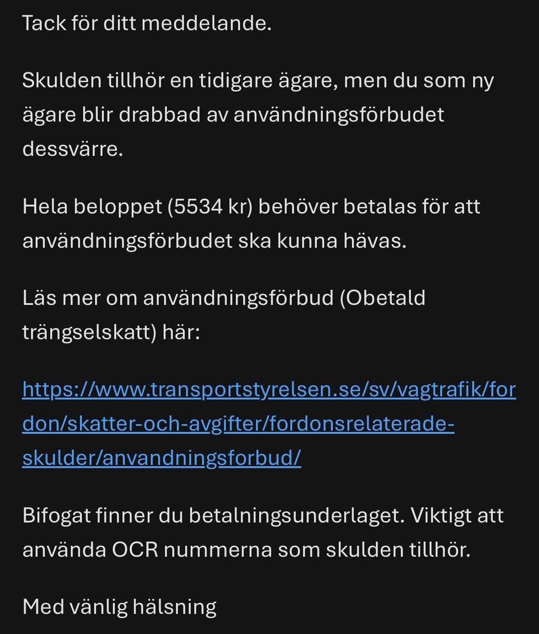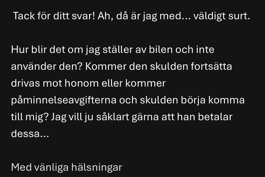 Som en av er kommenterade så försvinner skulder 2031. Om fem år. Bra om nån vill veta. Förändrar inte min situation iallafall då jag vill kunna använda skiten. Är en Tesla model 3. Så ja, det är fortfarande en dyr bil (165 000kr) Men fortfarande vidrigt att behöva betala någon annans skuld på 35000kr.
