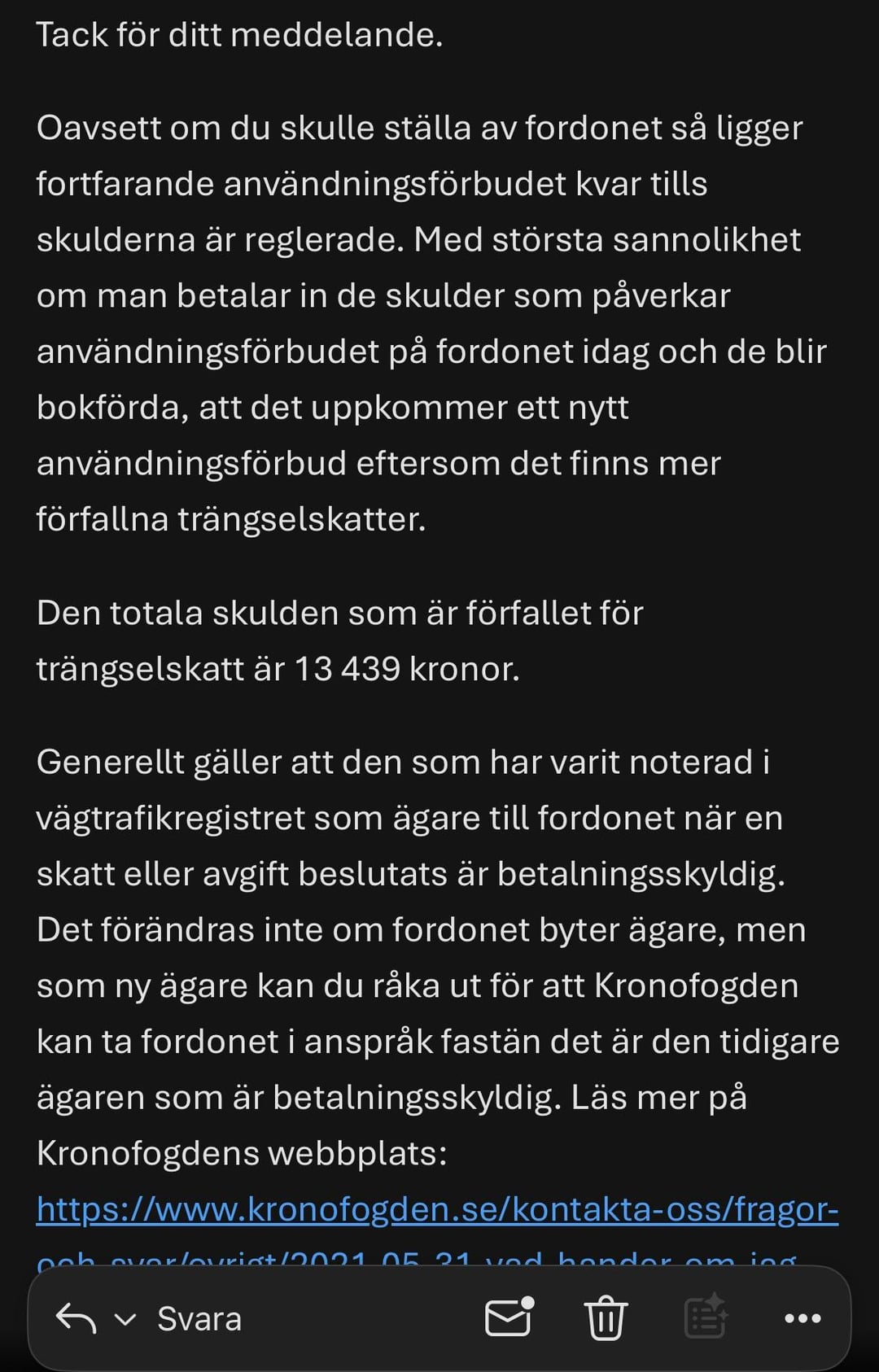 [https://www.transportstyrelsen.se/sv/vagtrafik/fordon/skatter-och-avgifter/fordonsrelaterade-skulder/](https://www.transportstyrelsen.se/sv/vagtrafik/fordon/skatter-och-avgifter/fordonsrelaterade-skulder/)