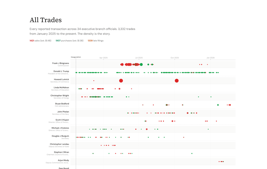I’m a journalist, turned web developer, with 15+ years in reporting and investigations. Congress has about 19 stock trade trackers. The executive branch filings are scattered across PDFs with no clean way to see patterns. So I built one.