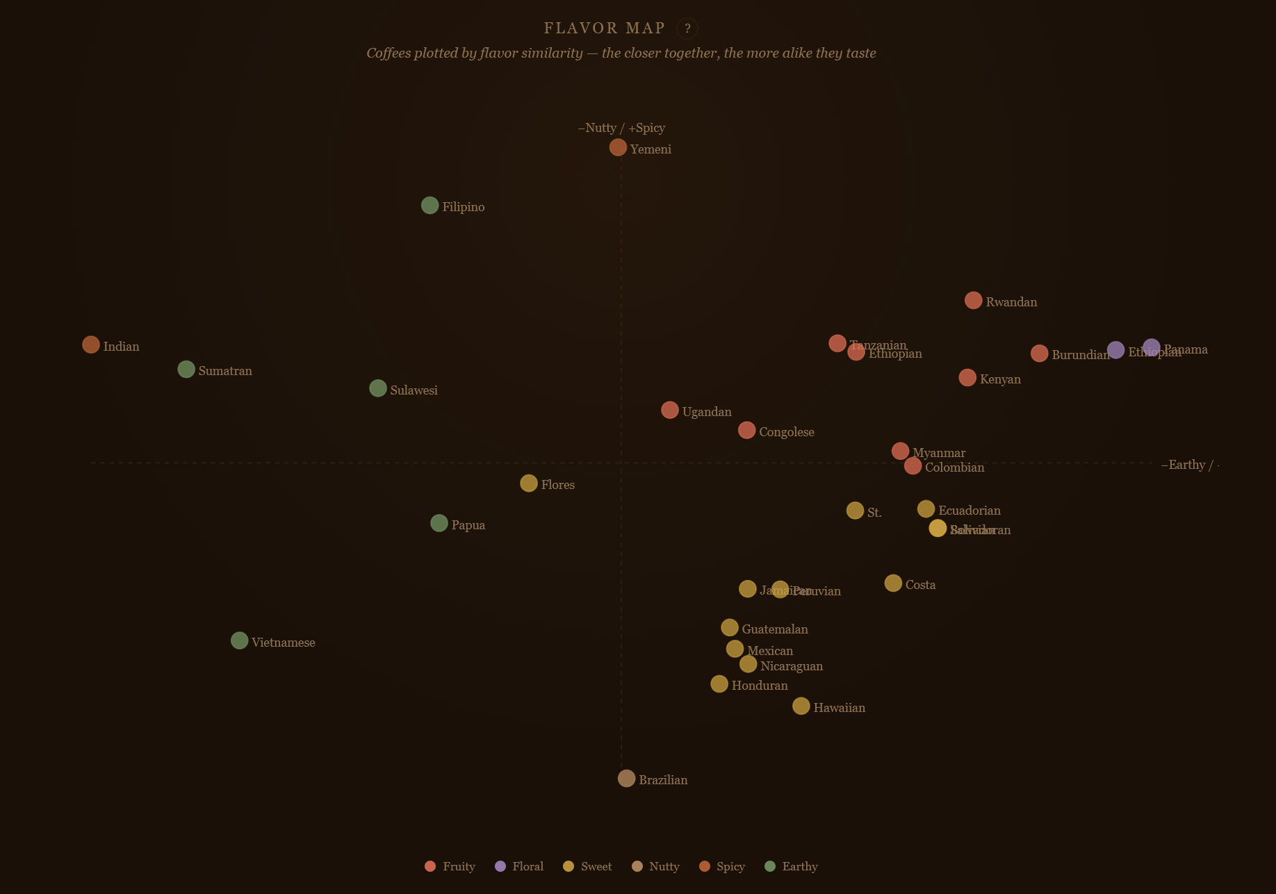 So I mapped 32 single-origin coffees across six flavor dimensions(Fruity, Floral, Sweet, Nutty, Spicy, Earthy) and built an interactive site around the data. Scores are calibrated to specialty-grade, light-to-medium roast for each origin.