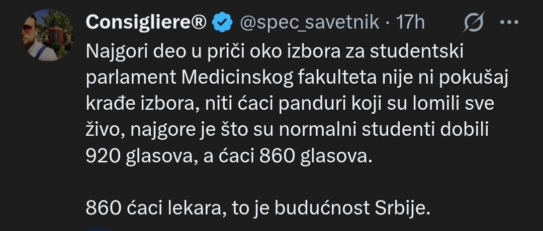 Nije toliko jednostavno. A i činjenica je da te Bastilje zvane studentski parlamenti padaju kao kule od karata, prvi put u iks vremena, čak i na “sistemskim” fakultetima (Medicins npr.). Nije to SNS 1/1 pa da možeš direktno da kažeš da je omladina glasala za Vučića.