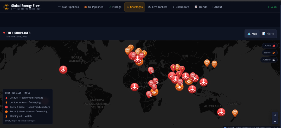 - 25+ active fuel shortages across 28 countries, plus new aviation alerts