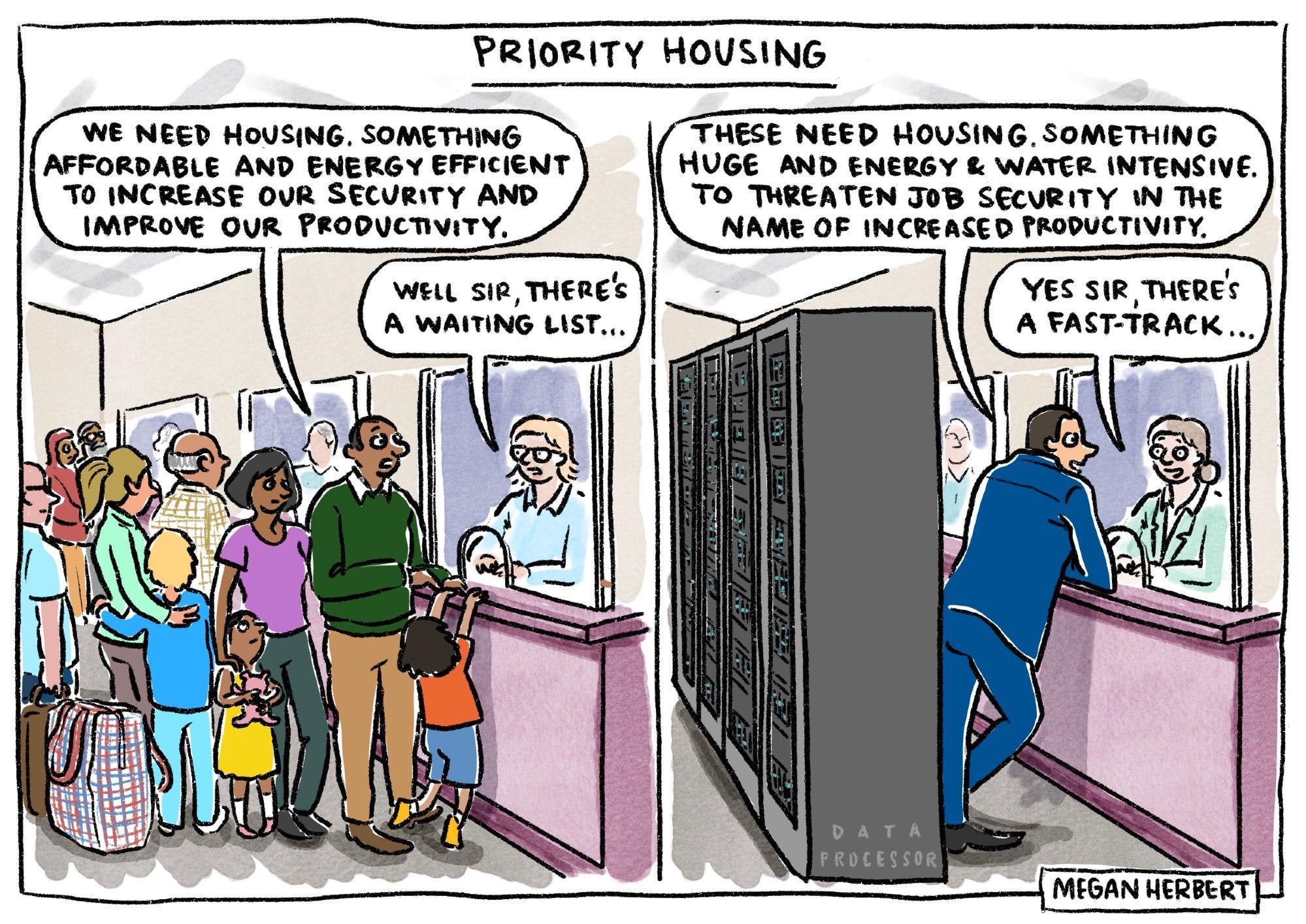 The image is divided into two panels, which look similar in that they are government offices of some kind with public servants behind glass windows answering enquiries. The office on the left is full of people from all walks of life lining up for assistance to find emergency and affordable housing . One anxious man, whose wife and small children are with him, is at the window saying, "We need housing. Something affordable and energy efficient to increase our security and improve our productivity." The answer from the person behind the glass is, "Well sir, there's a waiting list…". In the right panel, the office is crowded with a huge bank of data processors. A man in a suit is leaning on the counter smilingly saying to the person behind the glass, "These need housing. Something huge and energy and water intensive. To threaten job security in the name of increased productivity." To which the person behind the glass responds, "Yes sir, there's a fast-track…"