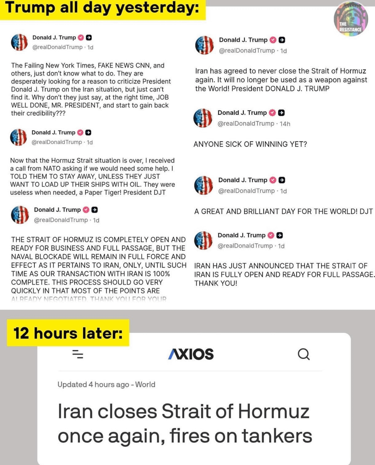 9. Iran ga pomoje igra. Rage baita ga. Za zaprtimi komunikacijami povejo eno potem, ko Američani (Trump na socialnih omrežjih) o tem poročajo, da bi stabilizirali delnice in podobno pa potem Irančani naredijo drugo. Potem še enkrat isto znova in znova.