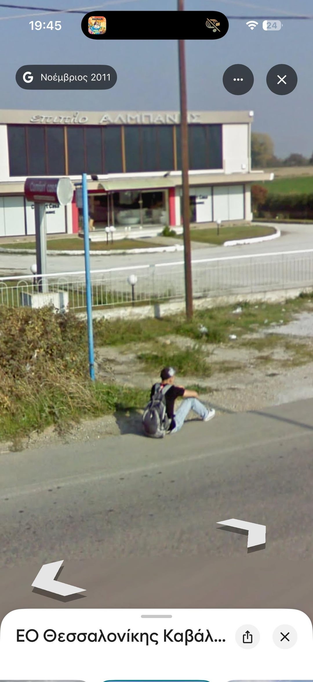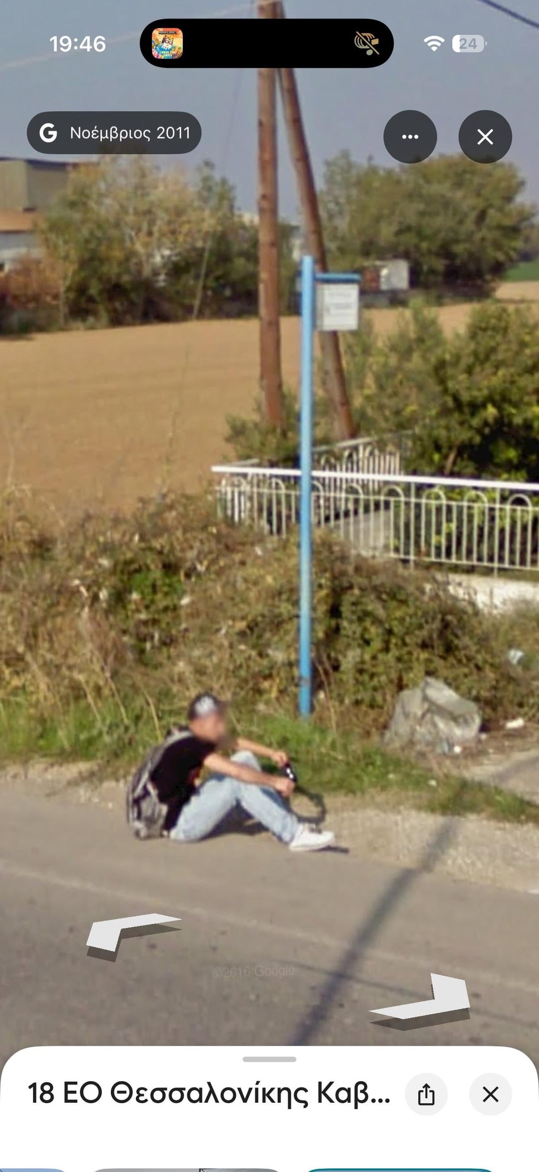 Καθώς έψαχνα μία διεύθυνση στους χάρτες Google, βρήκα παλιές λήψεις από τον Νοέμβριο του 2011 και βρήκα αυτόν τον τύπο να κάθεται κάτω από τη στάση του ΟΑΣΘ (στάση ΒΕΡΒΕΡΙΔΗΣ, στον δρόμο προς τον Αγ.Βασίλειο). Δεν ξέρω γιατί, αλλά με έπιασαν οι μελαγχολικές μου σκέψεις. Ποιος είναι άραγε αυτός ο νεαρός, τον οποίο έπιασε το όχημα της Google πριν από 15 χρόνια σε ένα φαινομενικά άκυρο μέρος; Ισως περίμενε το λεωφορείο. Πράγματι, αν πάτε λίγο πιο μπροστά ακολουθώντας τον δρόμο προς τον Άγιο Βασίλειο, θα δείτε ένα αστικό να έρχεται προς το μέρος του. Ισως ήταν εκεί για δουλειά, σε ένα από τα εργοστάσια που υπάρχουν ακόμη σ’ εκείνη την περιοχή. Γνωρίζει άραγε ότι υπάρχει αποτυπωμένος σ’αυτην ακριβώς τη στιγμή, παγωμένος για πάντα στον χρόνο καθώς περιμένει ένα όχημα να τον παραλάβει; Να ένας λόγος που μ’αρέσει το street view. Μπορείς να βλέπεις την παλιά σου γειτονιά/πόλη/χωριό και να βλέπεις πώς έχει (ή δεν έχει) αλλάξει καθώς περνούσαν τα χρόνια, σαν μία χρονοκάψουλα.