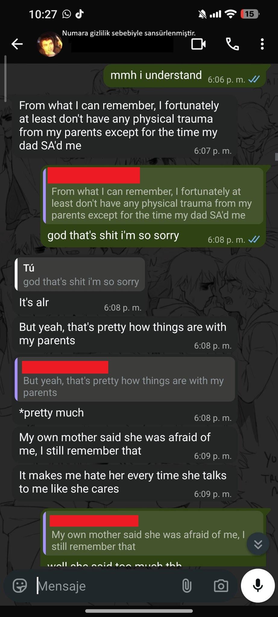 Annem veya babamdan flzlksel travma görmedim sadece babam bir kez bana ‘SA’ (sexually abused me yani cinsel taciz yaptı bir kez ) diyor en üstteki mesajda.