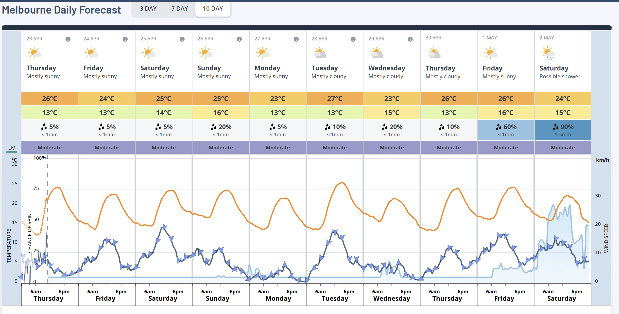 Not a day below 23 degrees is forecast for the next 10 days! We could see 12 days of 23+ degrees (21st April – 2nd May), and 13 days of 20+ degrees. The average around this time of year is 19 degrees. I am yet to find a year where this has occurred, the closest being 1923 which had 9 days above 25 (April 9-17).