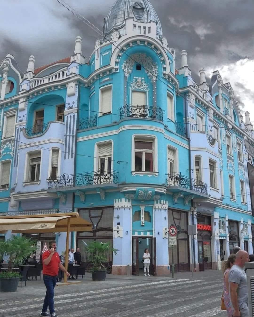 This blue Art Nouveau palace was built in 1905 by a Jewish merchant. Survived 2 wars, communism, and a 1977 earthquake. Still standing in Oradea, Romania [OC]