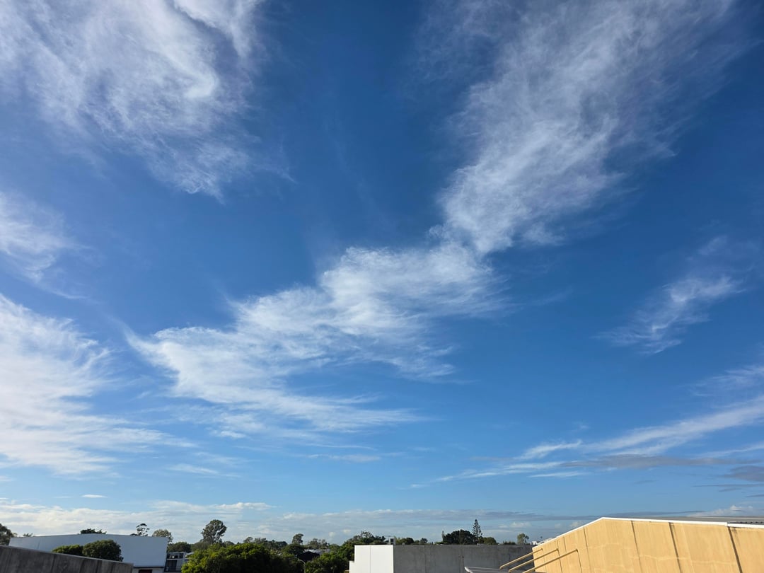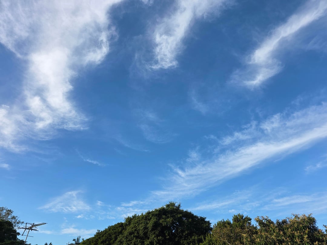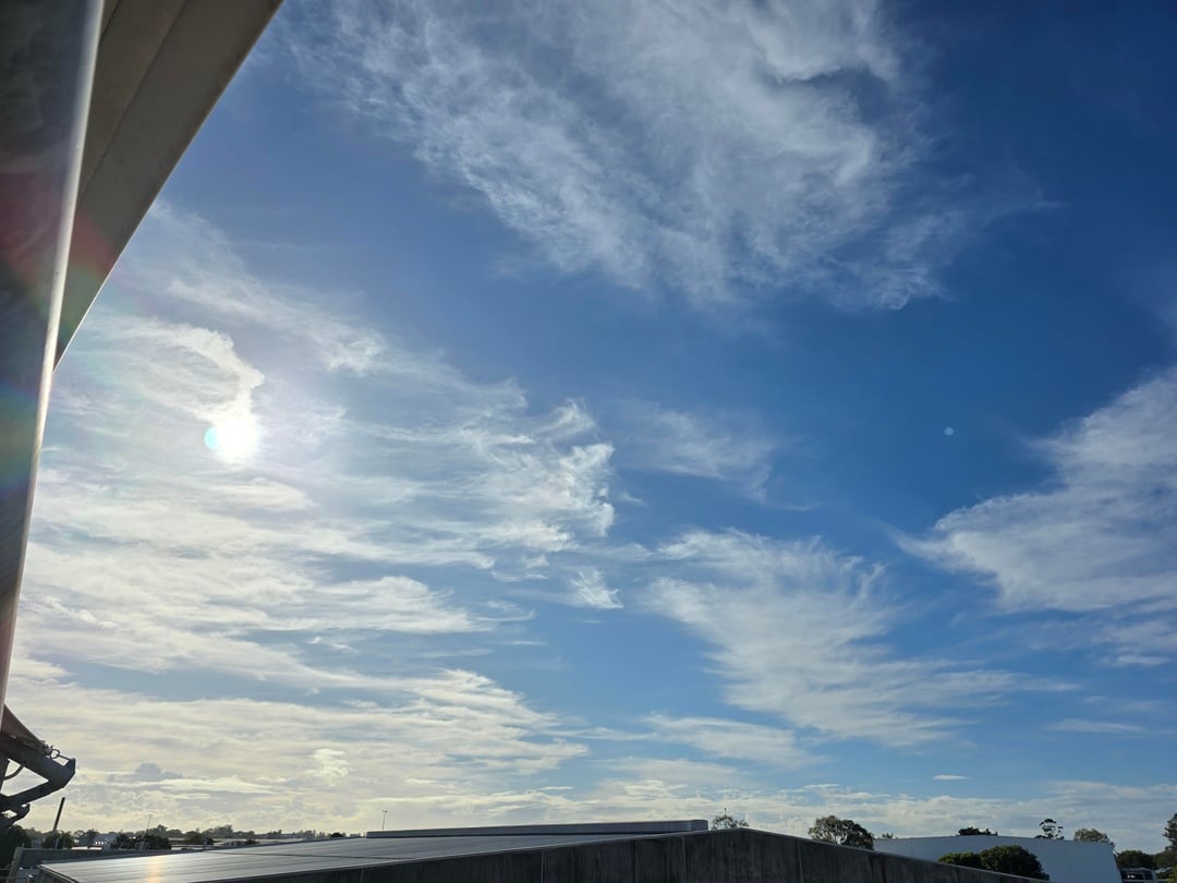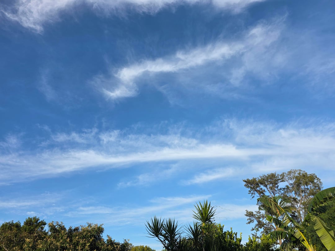 Cloud report: Lovely white line Cirrus to thick Cirrus spissatus clouds above drifting slowly from the W at 8Km. Some light grey flat Stratocumulus stratiformis clouds at 1.3Km. No rain from these but we can expect onshore flow to blow in thick Cumulus that might deliver a tiny bit of rain midday.