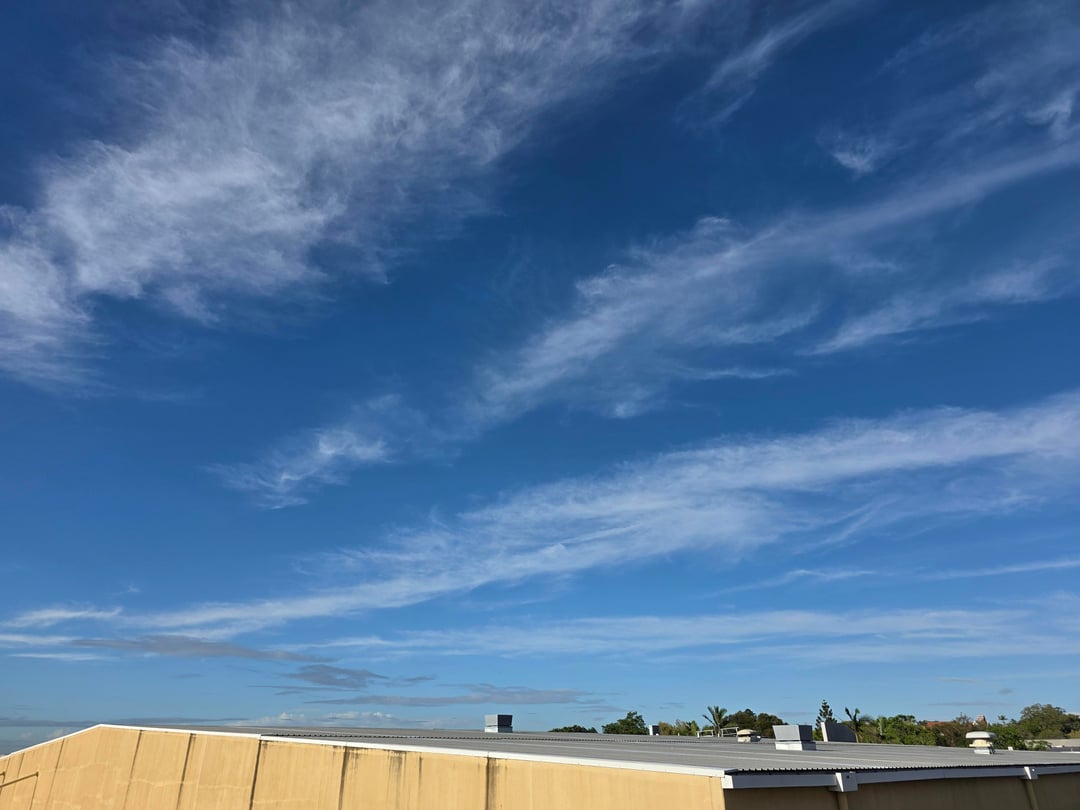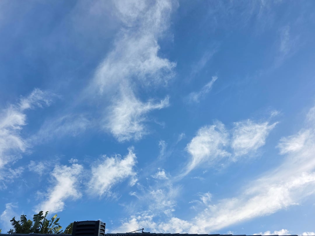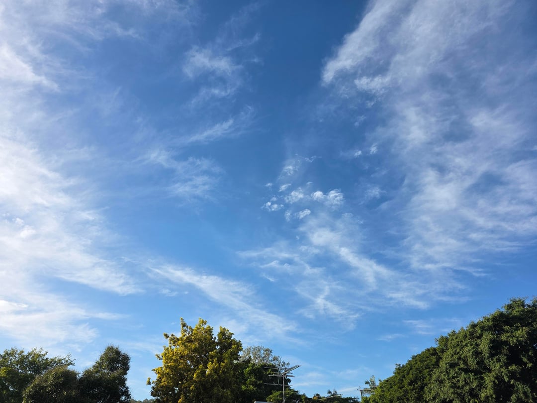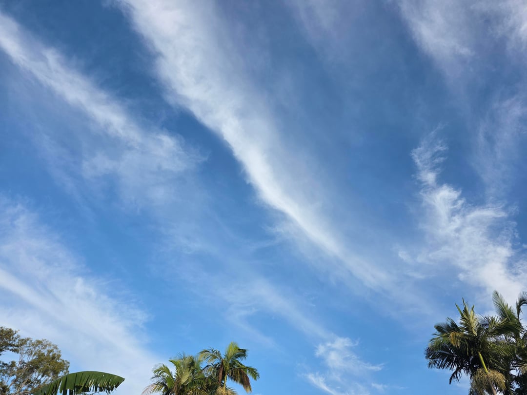 Cloud report: Lovely white line Cirrus to thick Cirrus spissatus clouds above drifting slowly from the W at 8Km. Some light grey flat Stratocumulus stratiformis clouds at 1.3Km. No rain from these but we can expect onshore flow to blow in thick Cumulus that might deliver a tiny bit of rain midday.