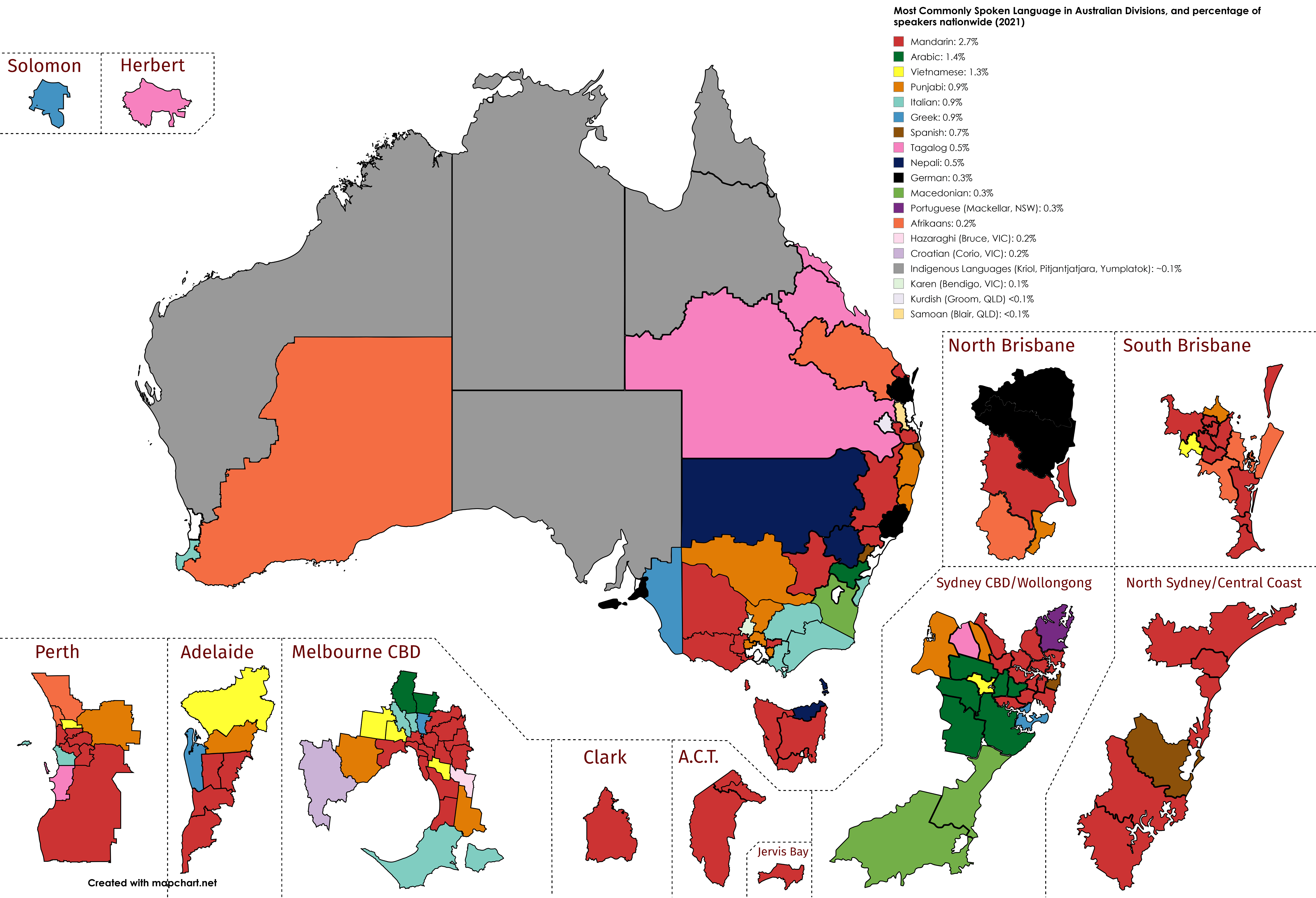 TIFO there is a language called Karen and this isn’t a swipe at Bendigo. That being said, this should be corrected to say “excluding English” because for a majority of these electorates that is the language spoken at home. I guess also it should be electorates and not divisions because these are based on federal government electorates as of the 2021 census