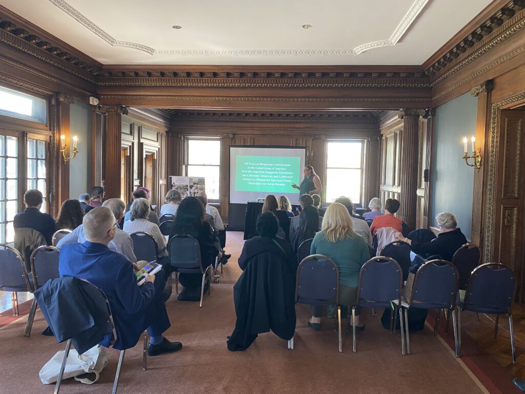 Drawing upon archival sources, institutional records, and exhibition histories, her lecture explored how AHF has functioned as both a repository and a cultural agent in shaping Hungarian American identity, analyzing three interrelated dimensions of AHF’s work: collection (acquisition and documentation of primary materials and ephemera); conservation (preservation and digitization initiatives, including major partnerships with the National Széchényi Library and Arcanum); and celebration (public exhibitions, lectures, and cultural programming that connect academic inquiry with community engagement). In reflecting on the AHF’s evolving mission, she also addressed broader theoretical questions of heritage mediation, institutional memory, and the ethics of representation in diasporic archives. She positioned AHF as a case study in how ethnic heritage organizations can bridge scholarship, pedagogy, and community identity—by offering a model for sustaining cultural continuity and academic relevance in the 21st century.