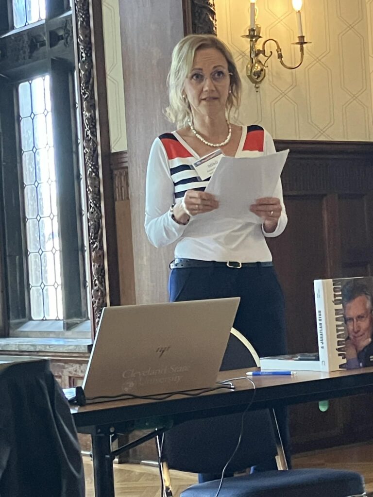 As lectures were given in three rooms simultaneously, I’m able to report only on a few of them. Associate Professor in the Institute of English Studies at the University of Pécs, Hungary, Mónika Fodor’s research focuses on narrative meaning-making, memory, trauma, identity, and narrative, and the narrative ramifications of reconstructing and digitalizing memories. According to her, in 2025, Hungary still faces deep social and economic fragmentation, with one-fourth of the population living in systemic poverty. She claimed that one of society’s biggest challenges is the lack of social solidarity, adding that voluntary organizations, such as the Hungarian Charity Service of Malta (HCSM), play a crucial role in fostering social solidarity by providing daily help to those in need. Her study examined how volunteers engaged in community service negotiate their experiences and identities through personal storytelling, with a focus on the issue of social solidarity.