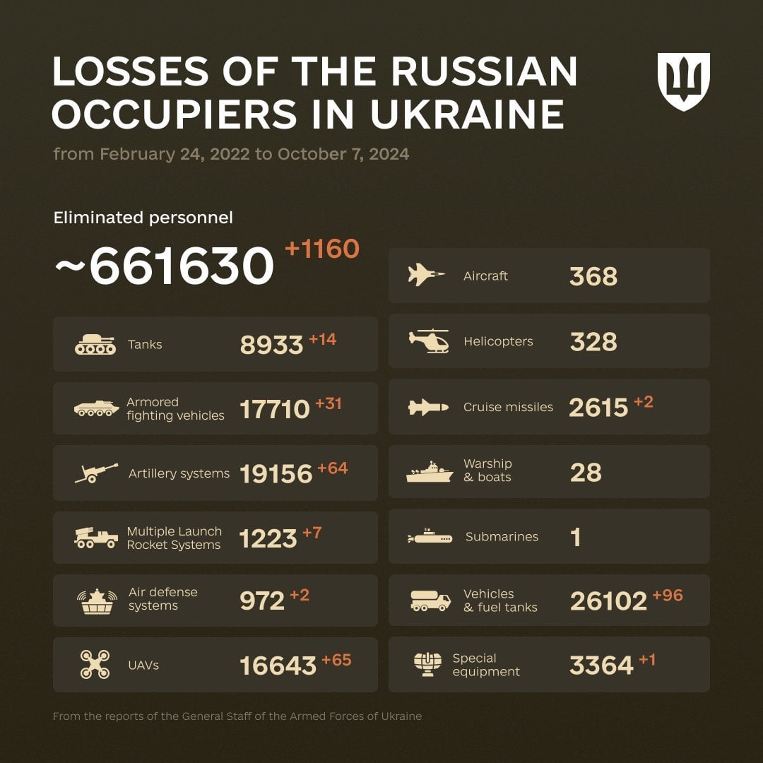Combat losses of the enemy from February 24, 2022 to October 7, 2024. https://image.upilink.in/Z11ZFJO3mRktPPX