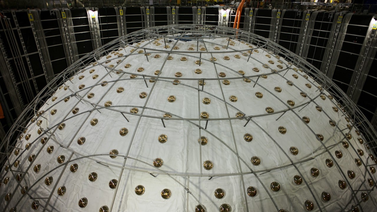 Although almost all the particles will pass through the detection liquid without a trace, some will interact with the liquid, triggering two flashes of light which will then be recorded by thousands of light-detecting phototubes.
