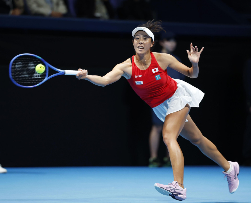 Japan’s Ena Shibahara returns a shot to Romania’s Miriam Bulgaru during their Group A tie in the Billie Jean King Cup women’s team tennis qualifiers on April 12, 2025, at Tokyo’s Ariake Colosseum. (Kyodo)