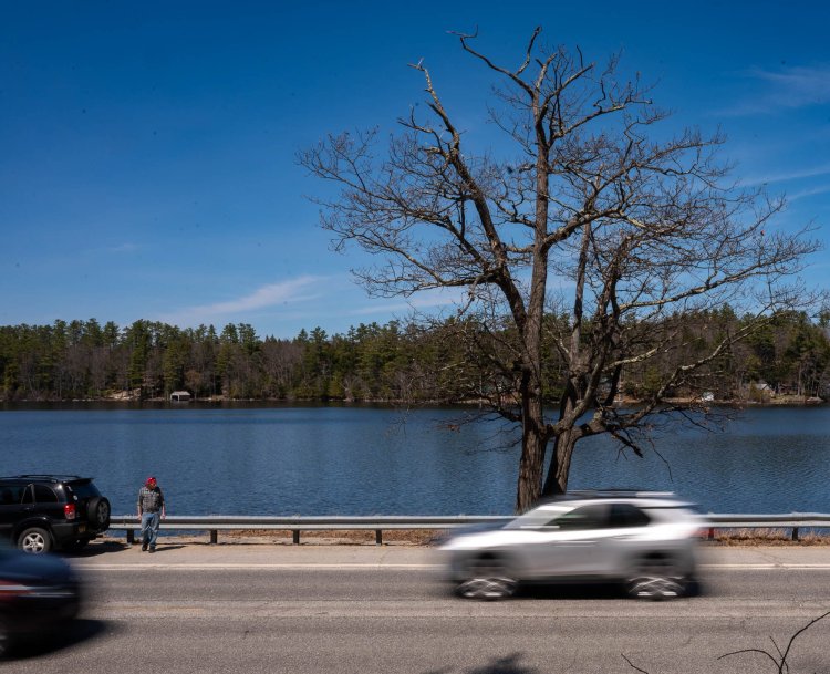 Traffic speeds along Monday on Lake Road/Routes 117 and 118 in Norway. The large oak tree next to Lake Pennesseewassee marks a popular fishing spot, where people will park on the shoulder and climb over the guardrail. Andree Kehn/Sun Journal